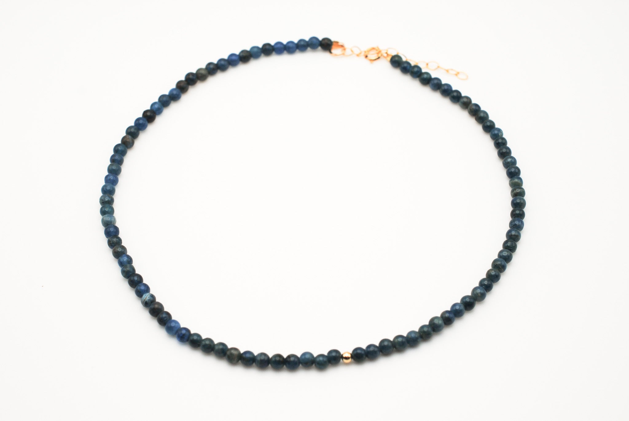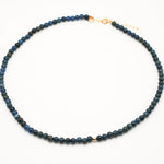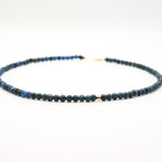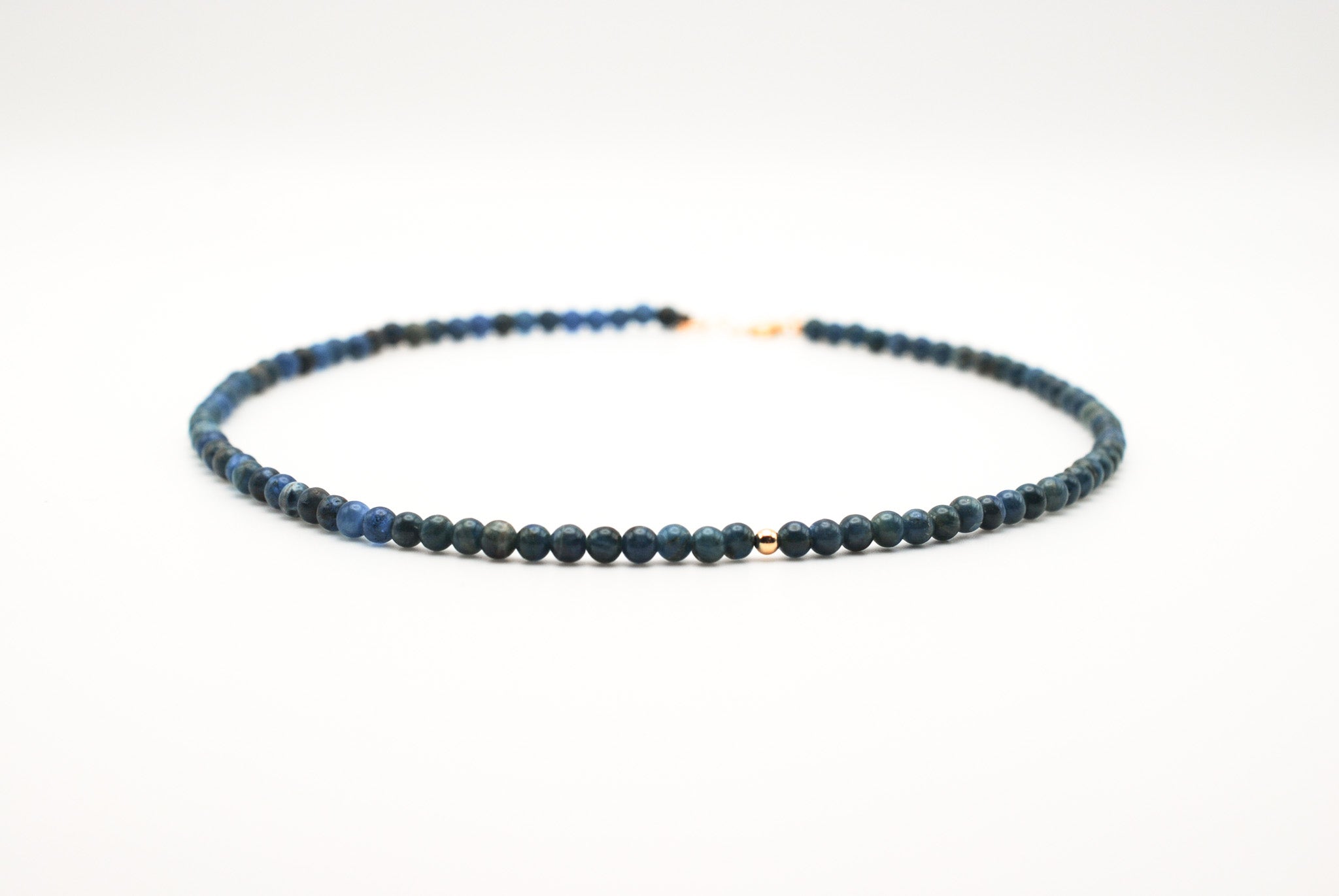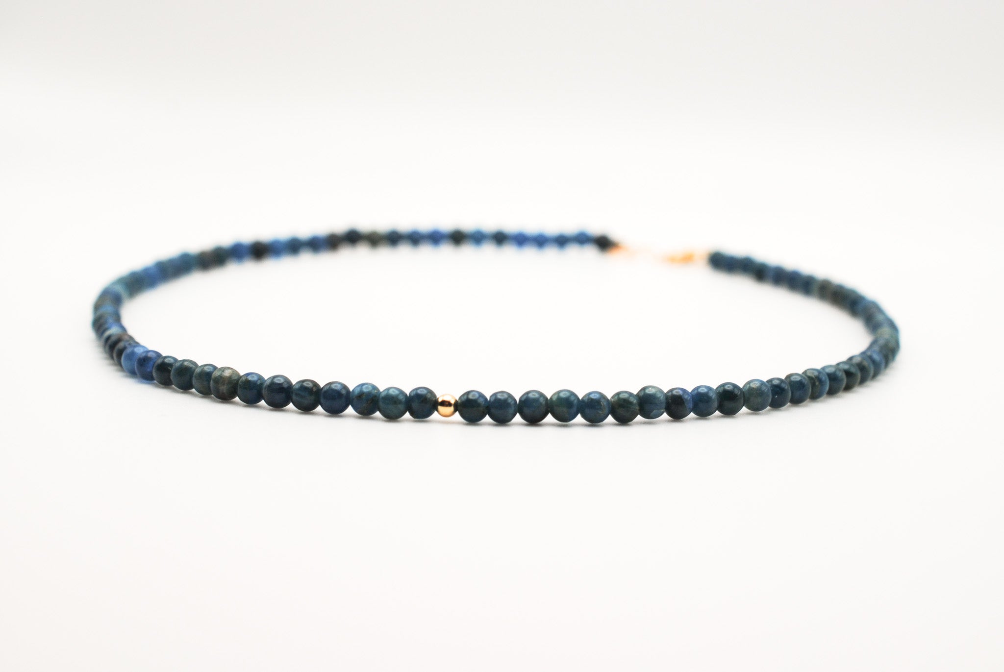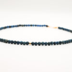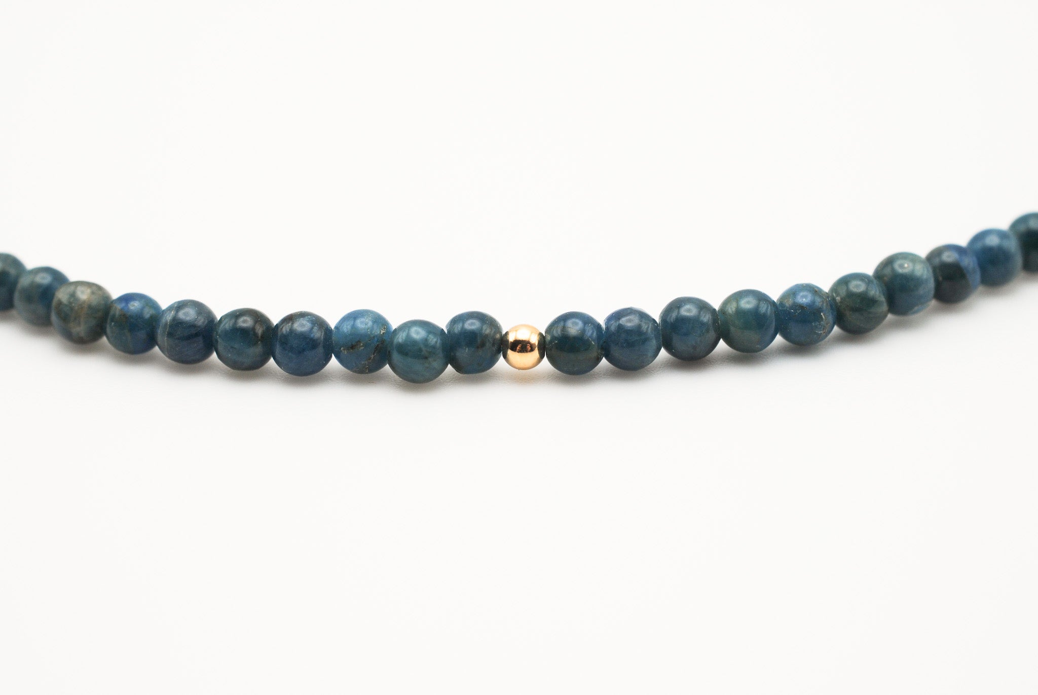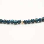 Size: 14 inch choker strung with 4mm apatite stones and 1 gold filled off center bead with a 2 inch gold filled extender chain