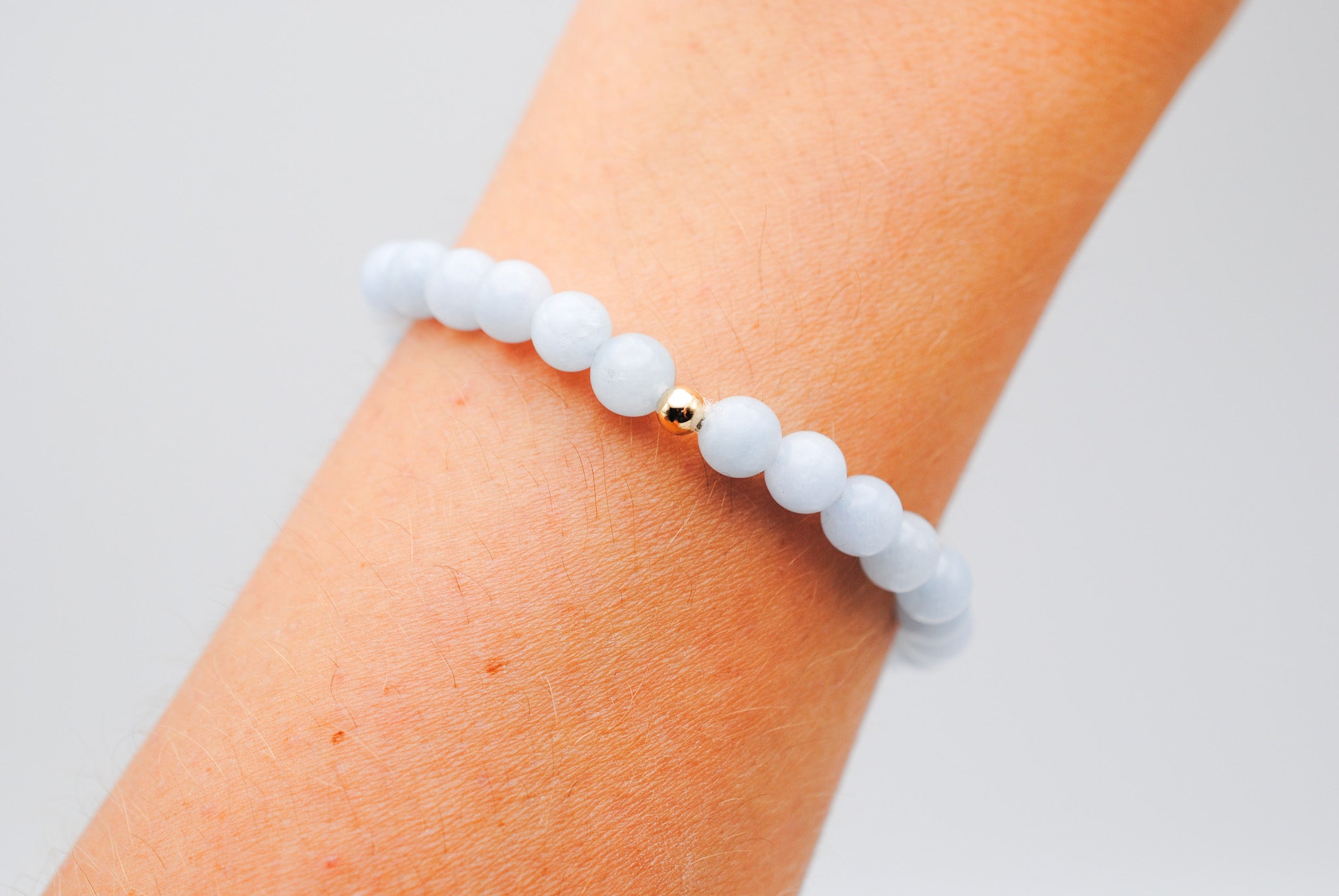 Details: 6mm beaded aquamarine stones with 1 14K Gold Filled bead