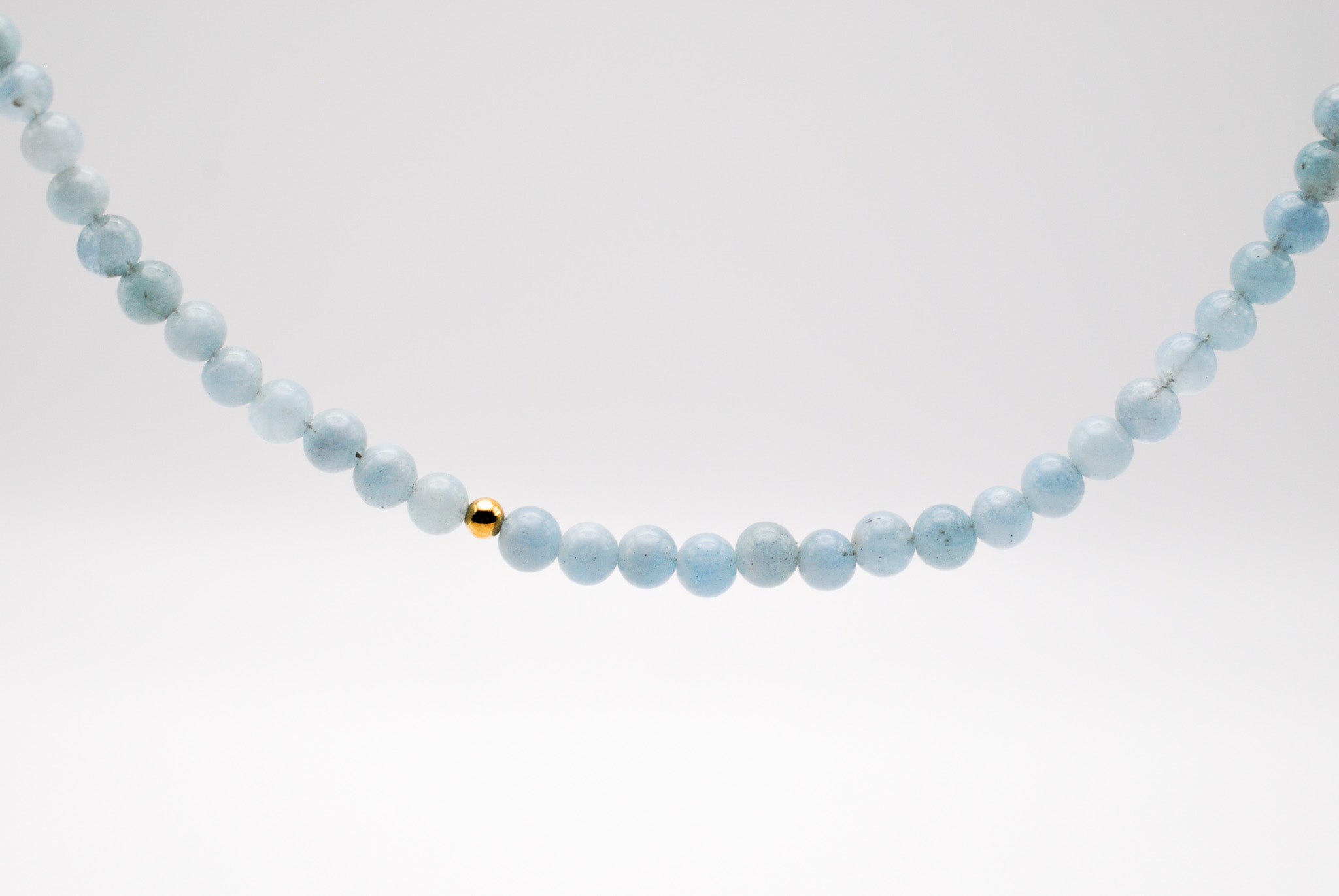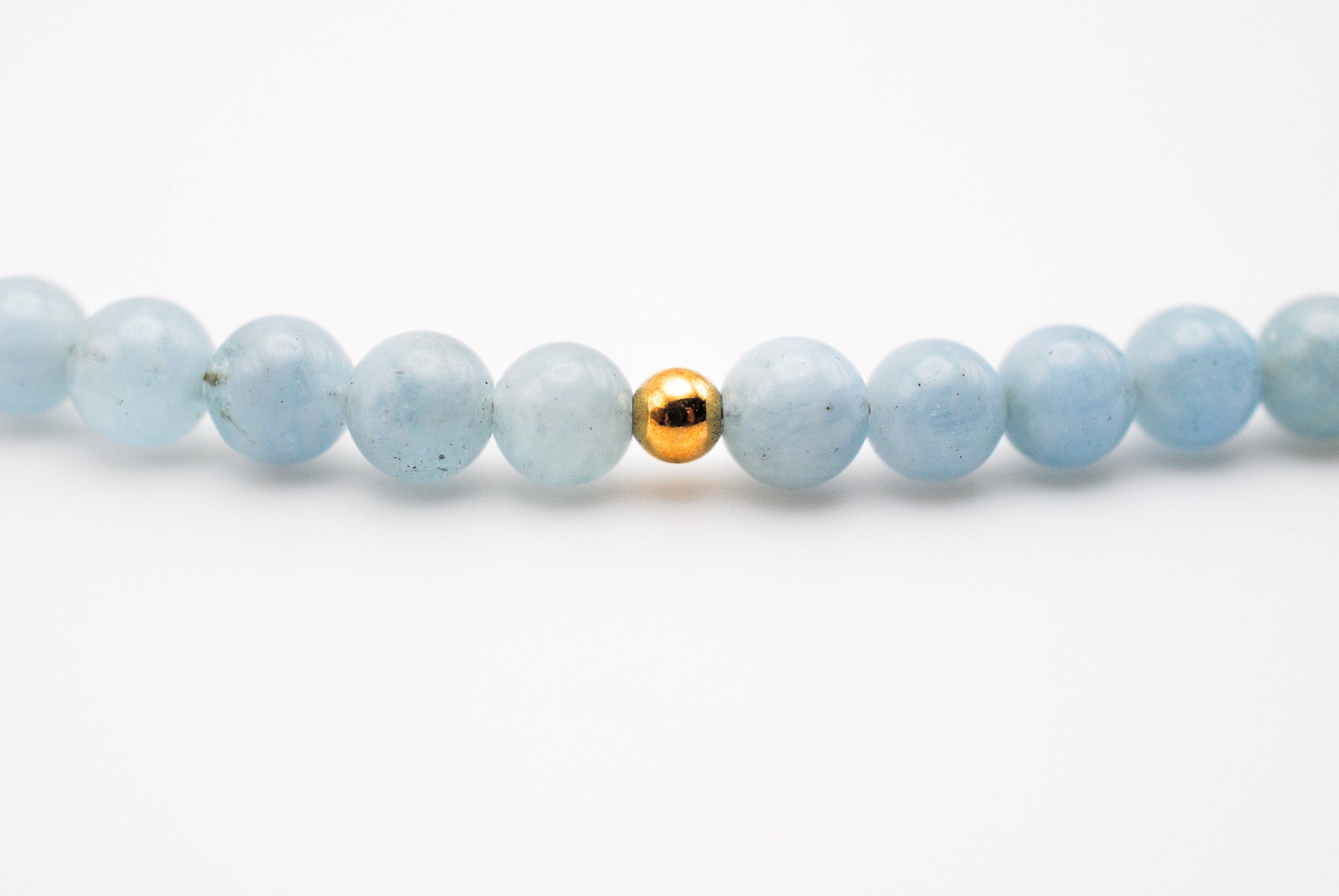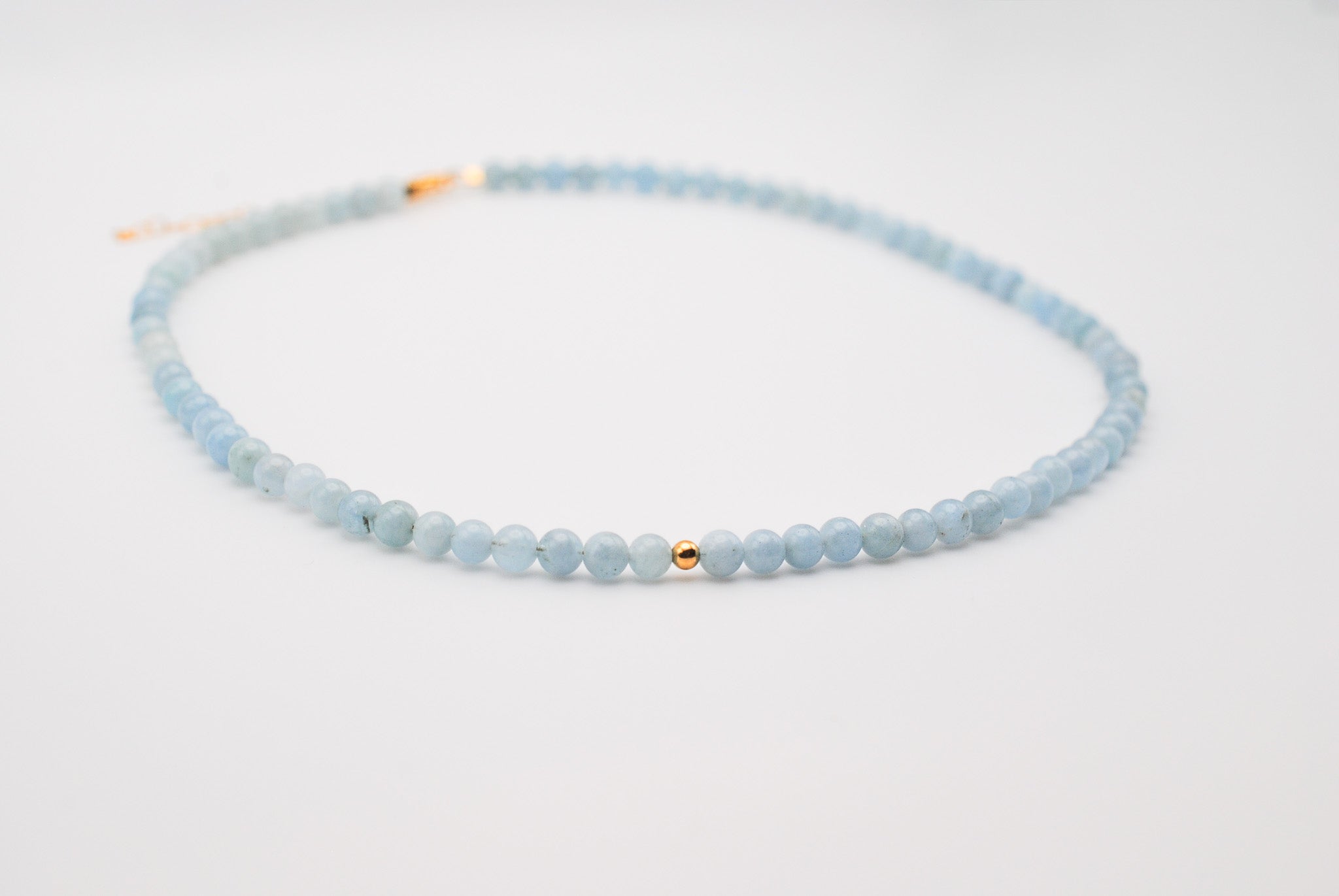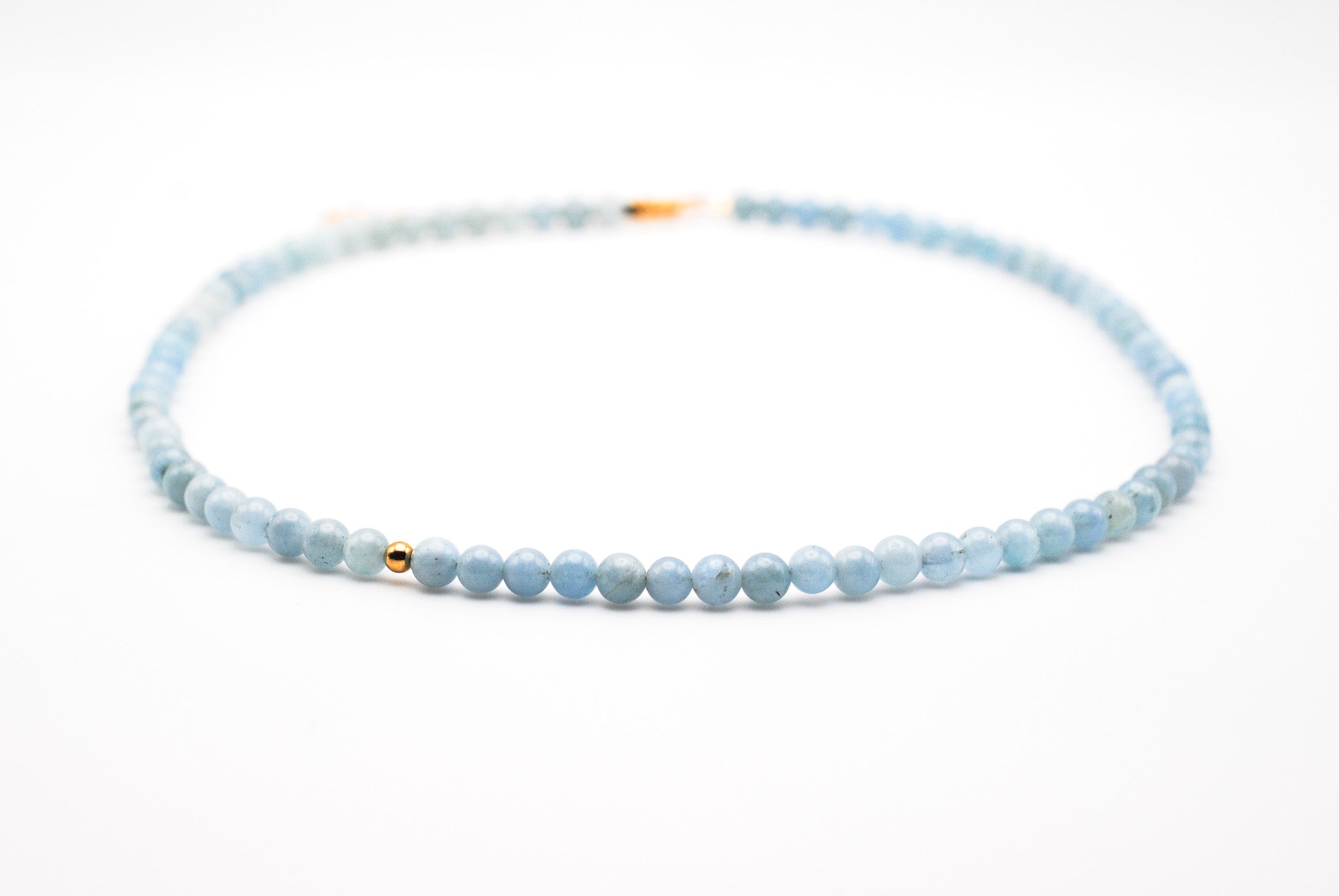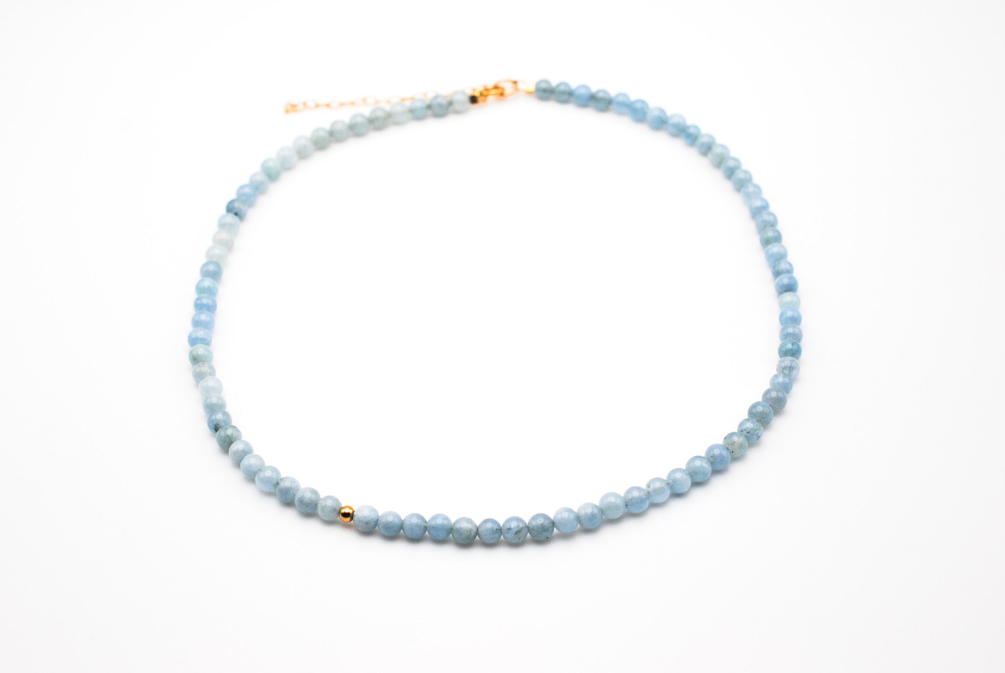 Size: 14 inch choker strung with 4mm aquamarine stones and 1 gold filled off center bead with a 2 inch gold filled extender chain