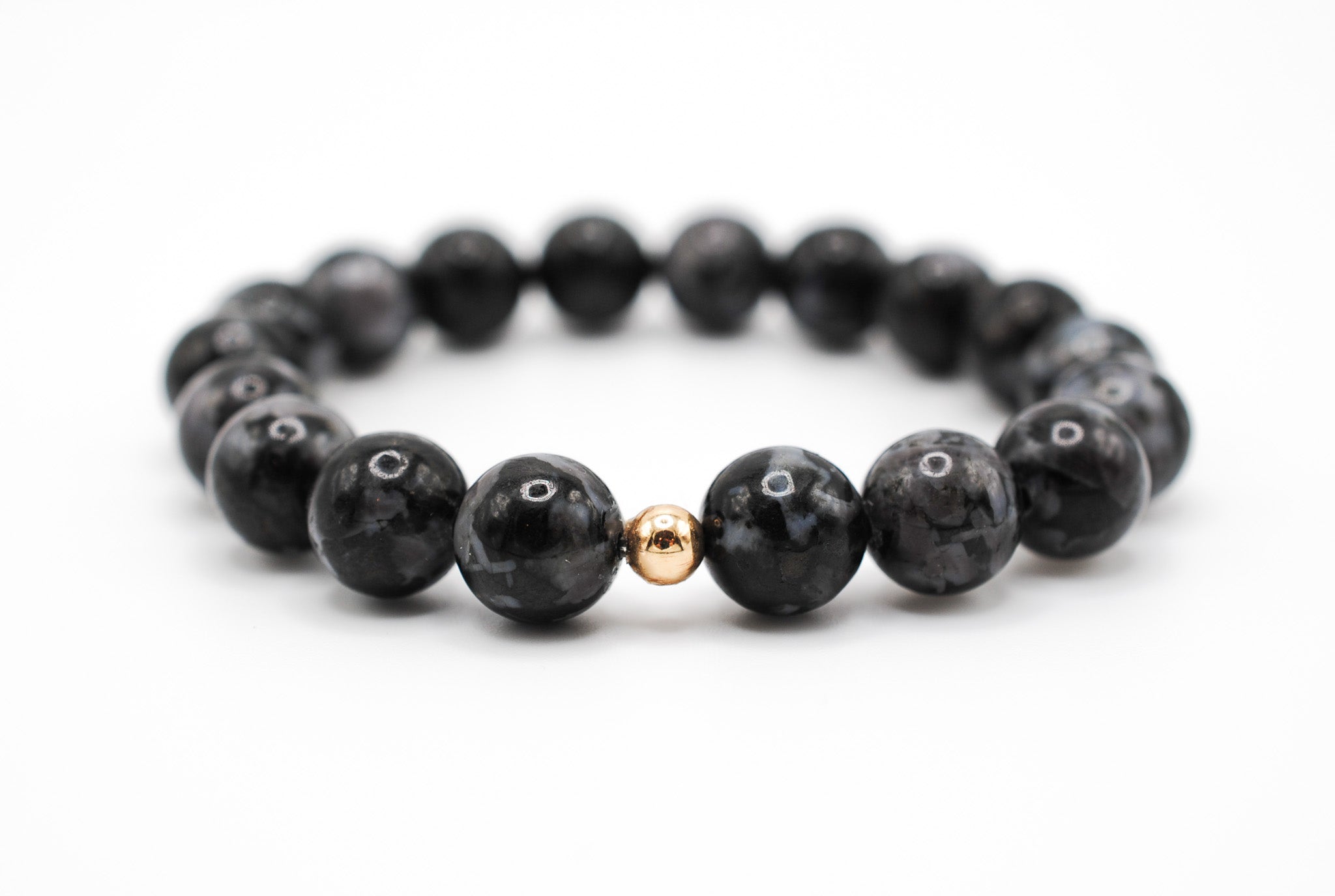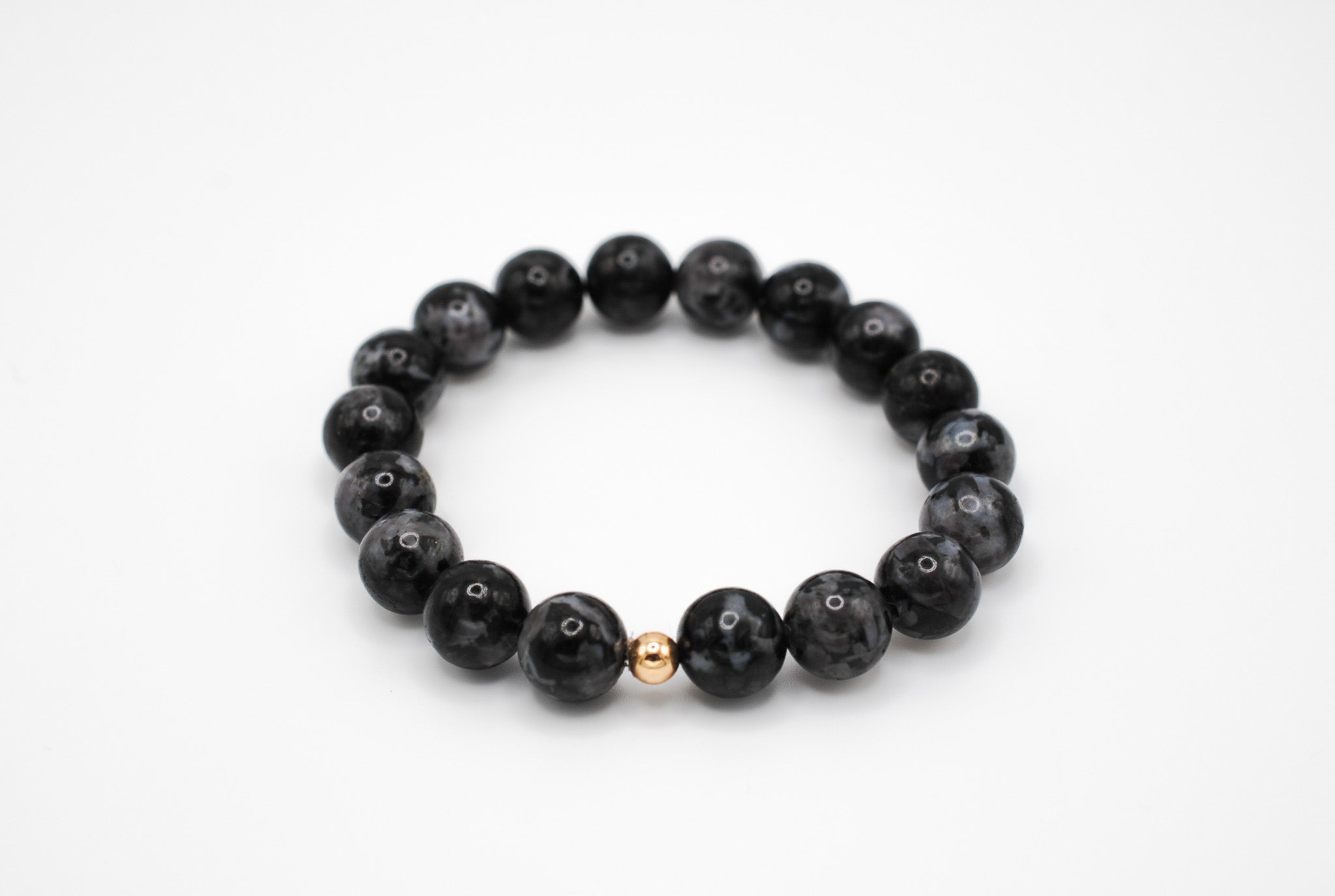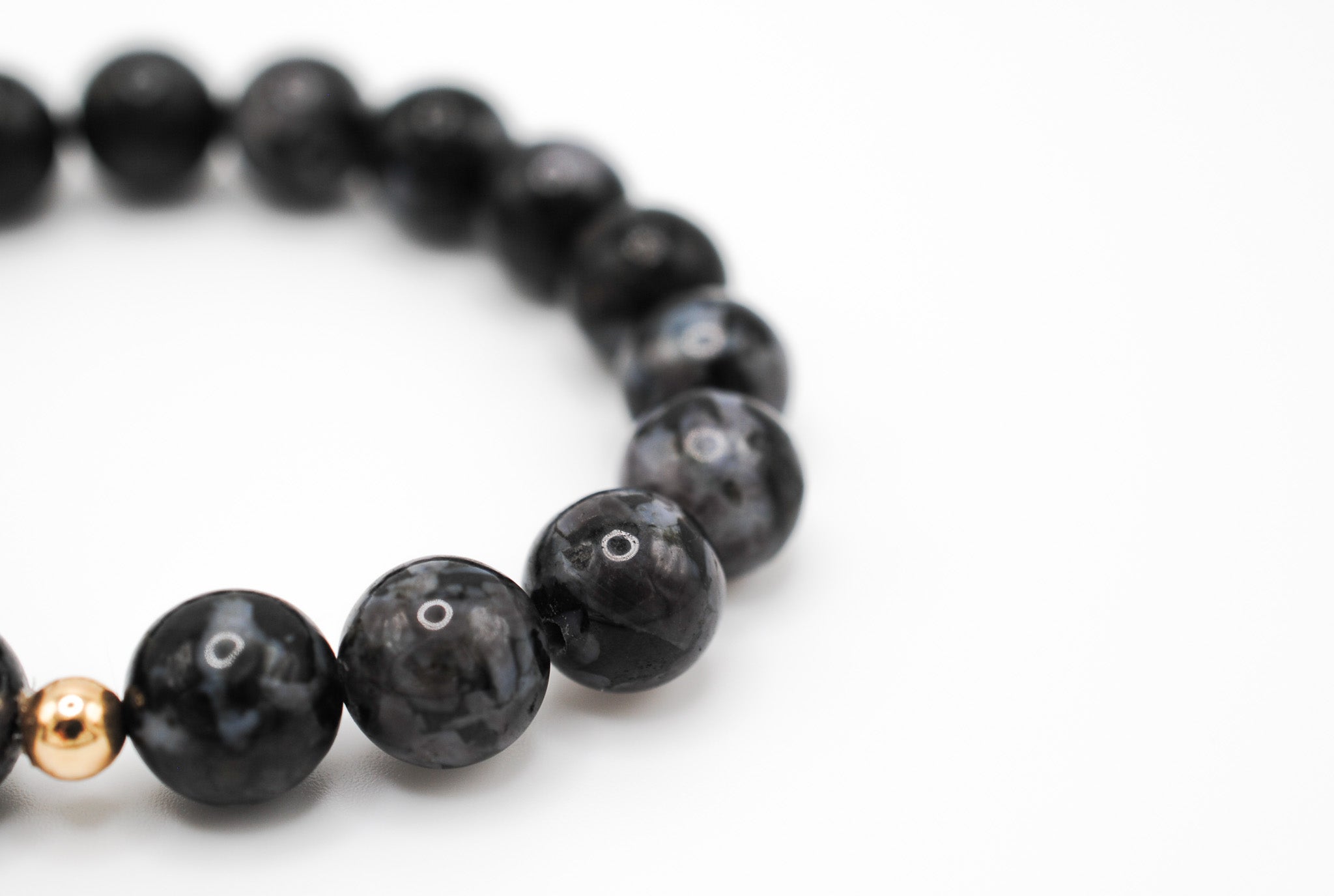 Details: 10mm beaded indigo gabbro with 1 14K Gold Filled bead
