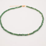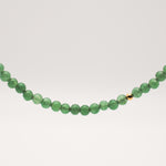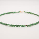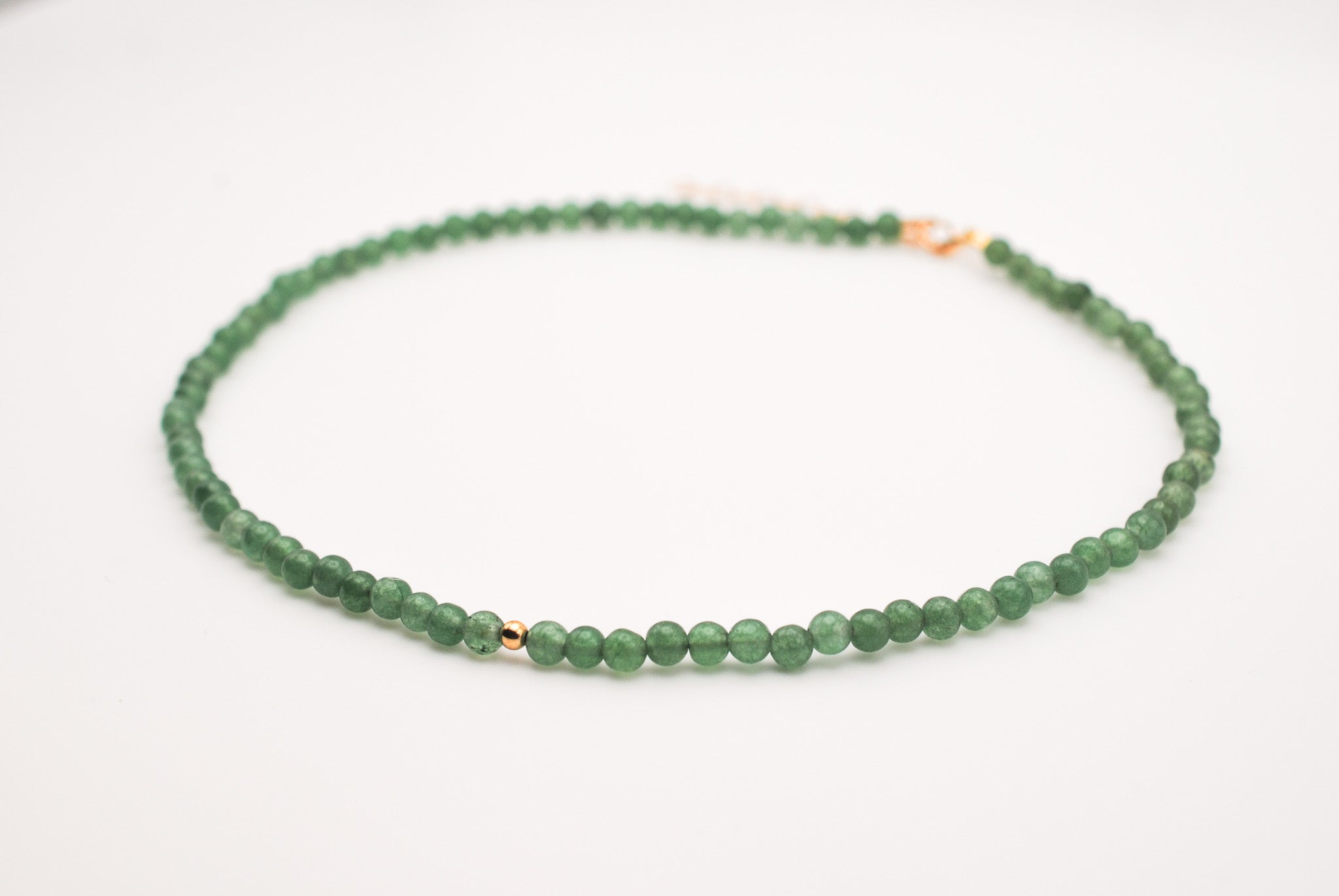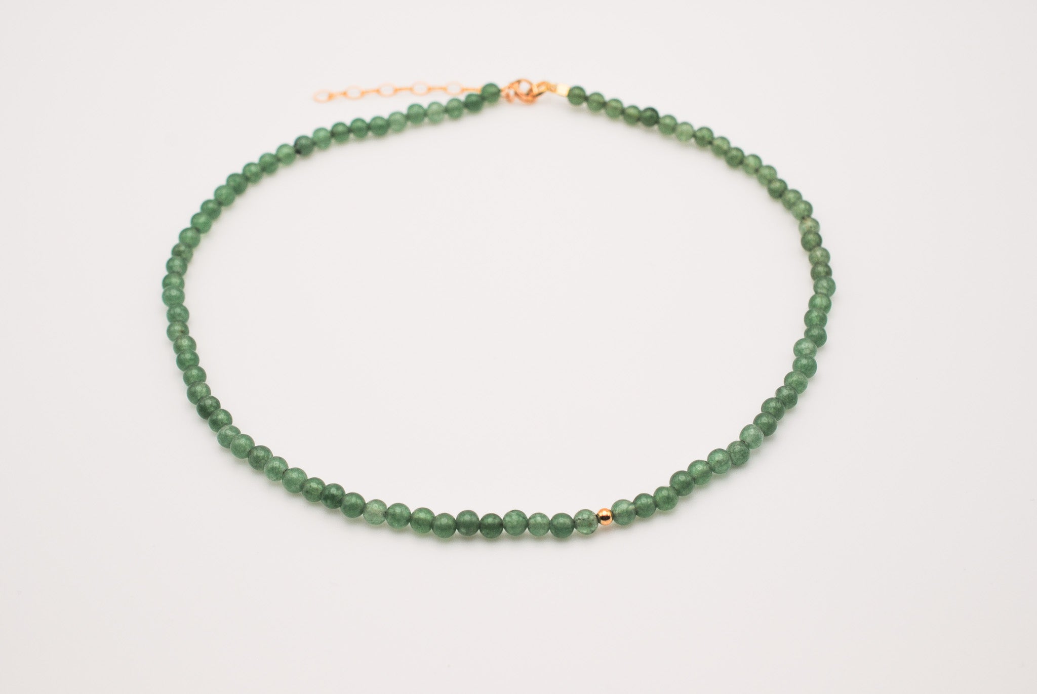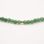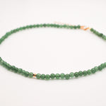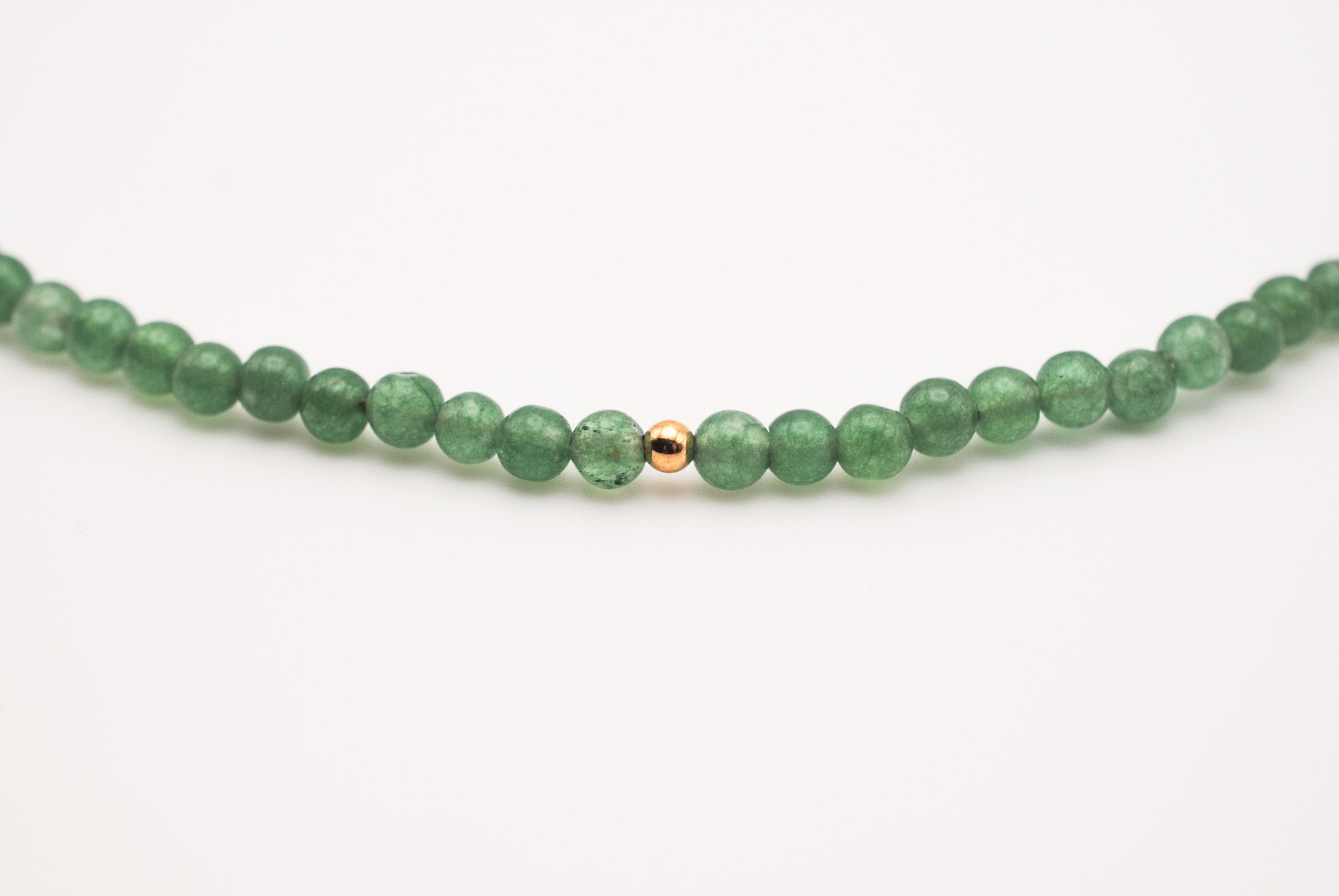 Size: 14 inch choker strung with 4mm aventurine stones and 1 gold filled off center bead with a 2 inch gold filled extender chain