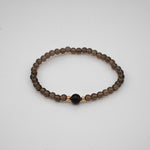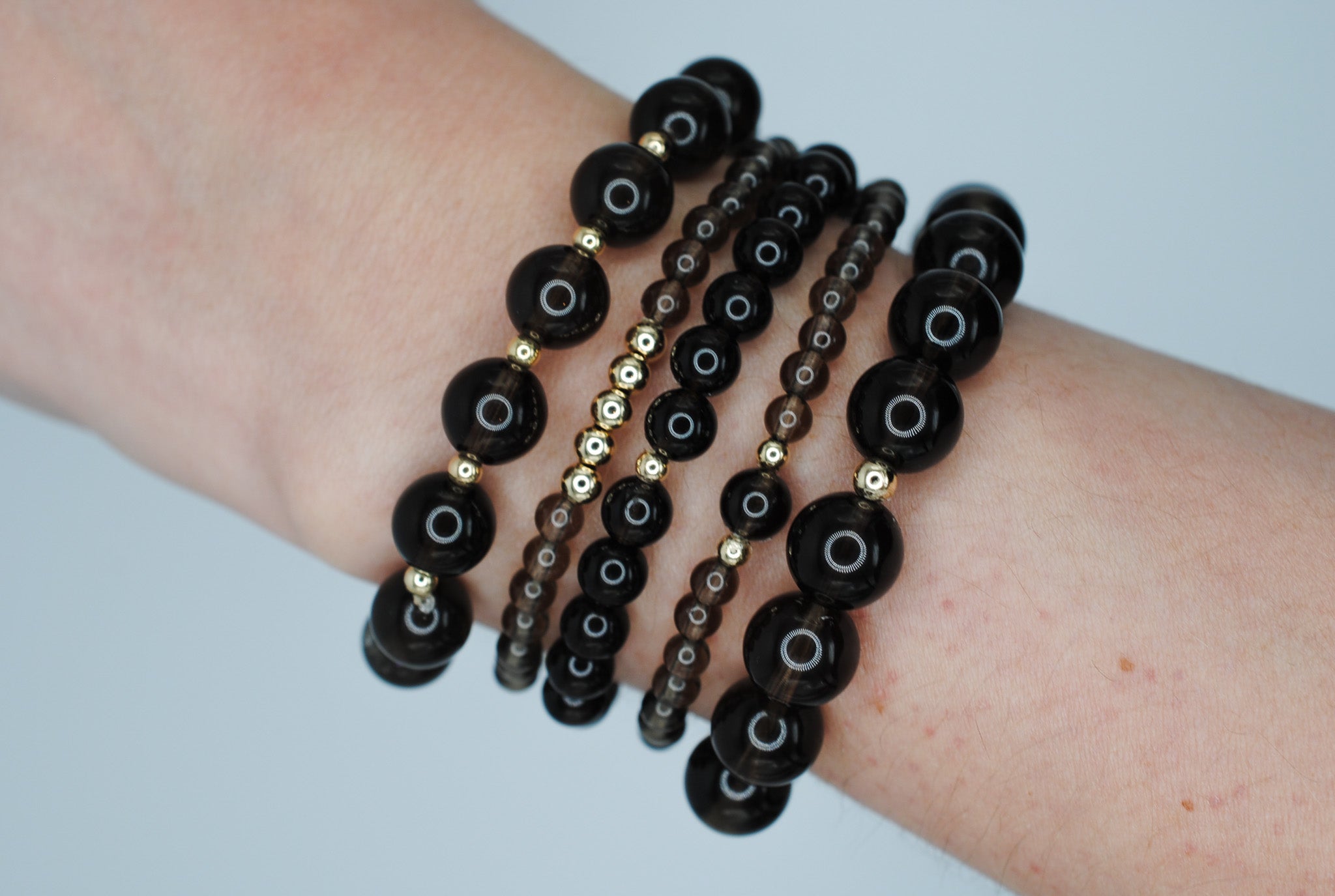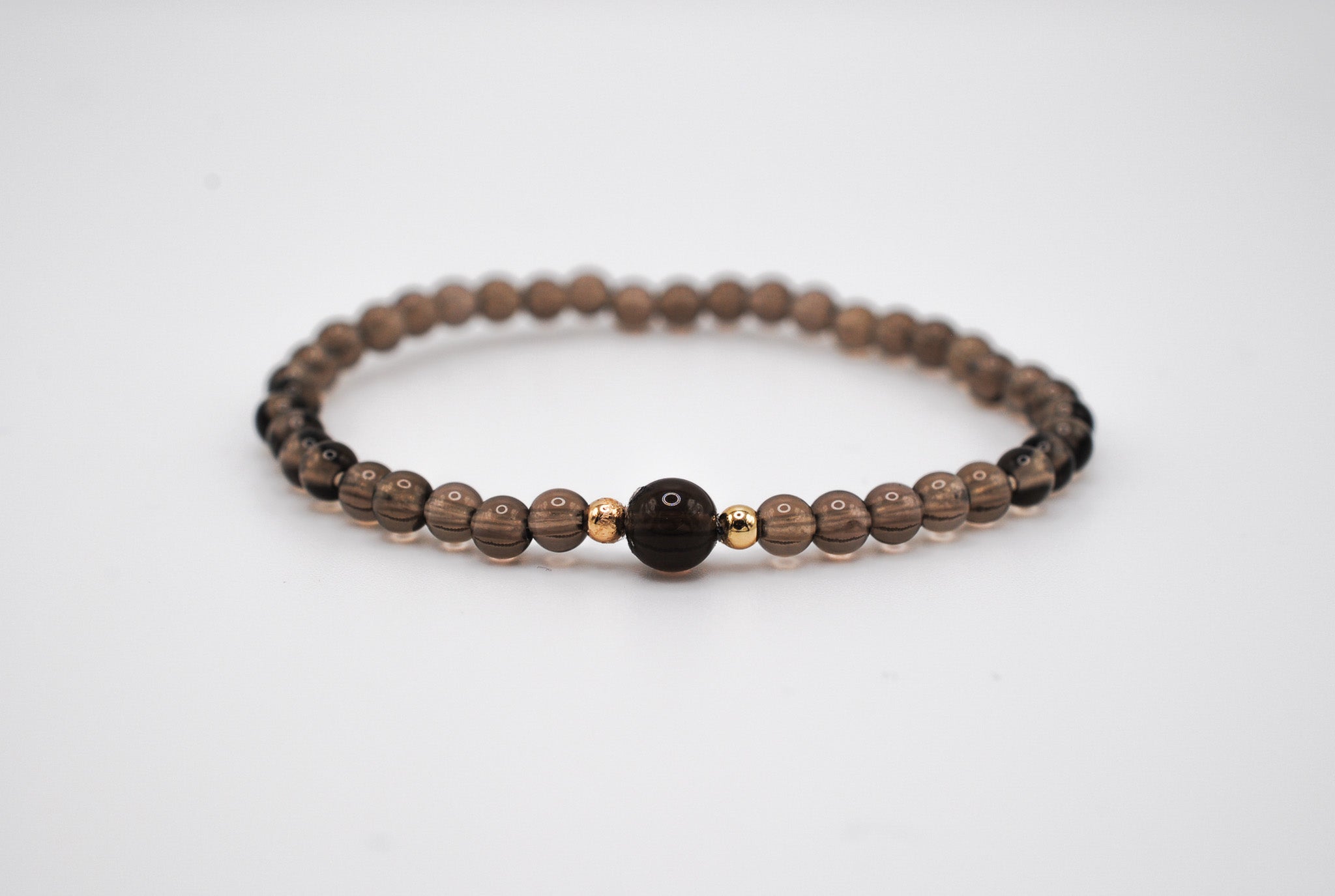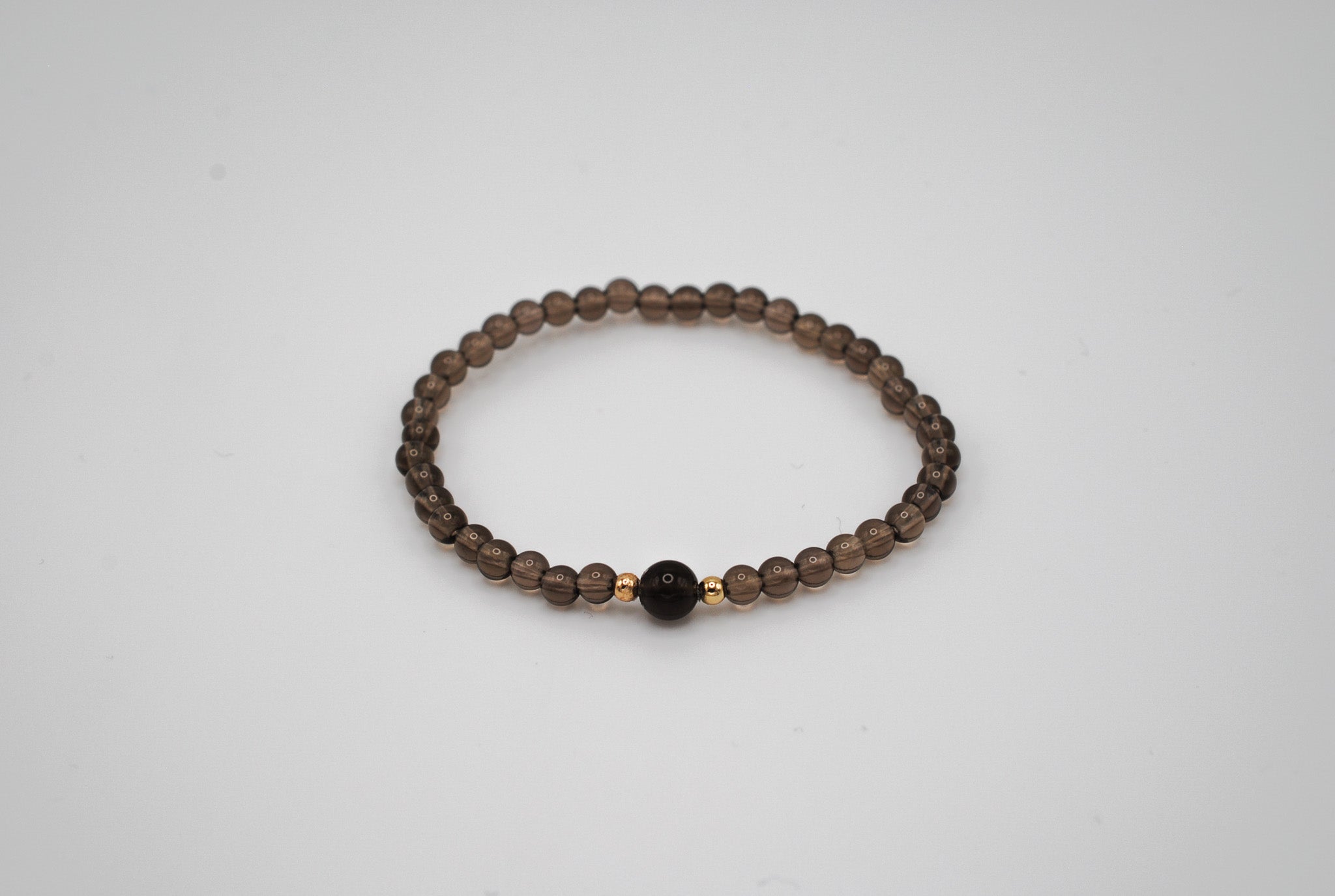 Details: 4mm beaded smokey quartz with (1) 6mm beaded smokey quartz and (2) 14K Gold Filled beads