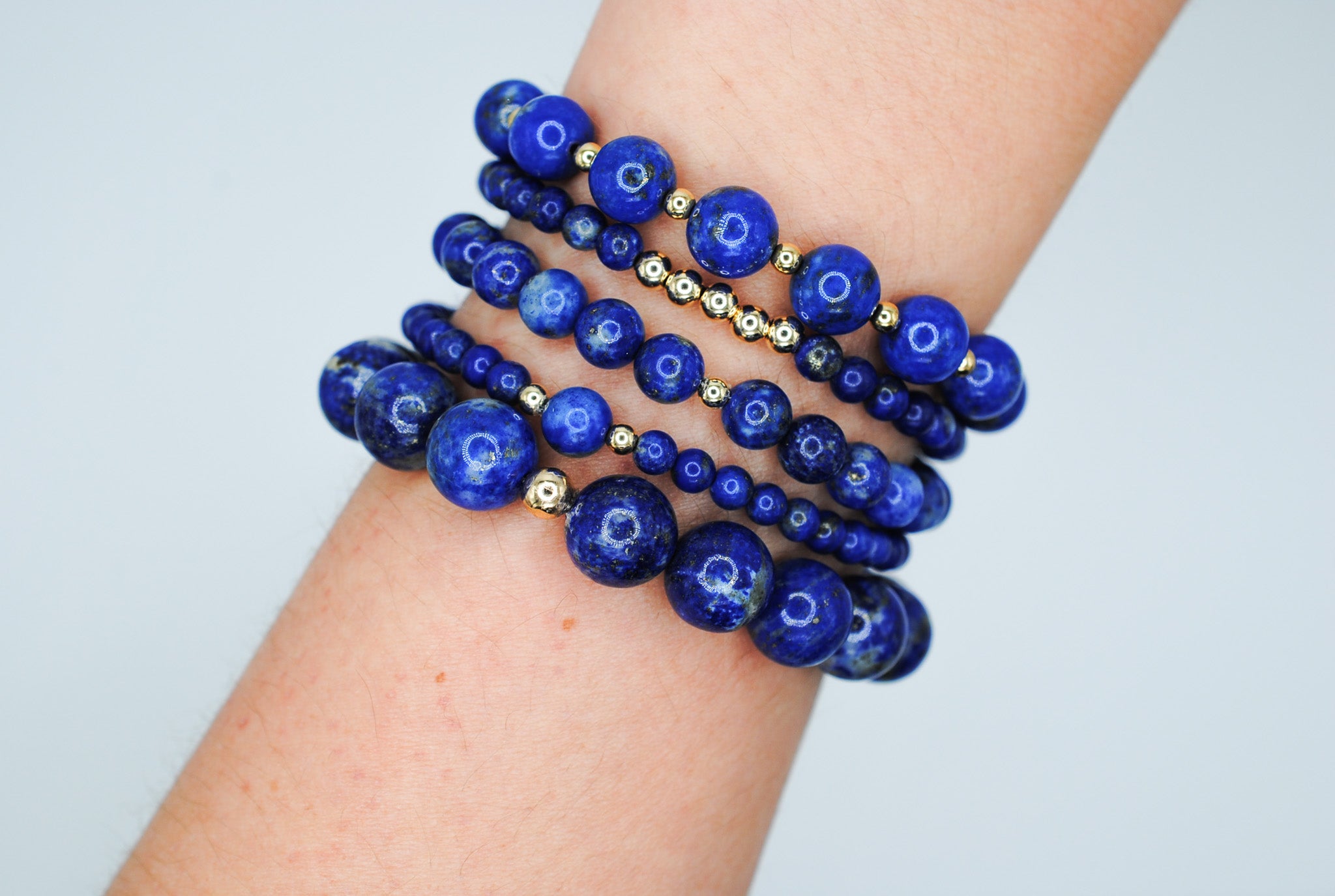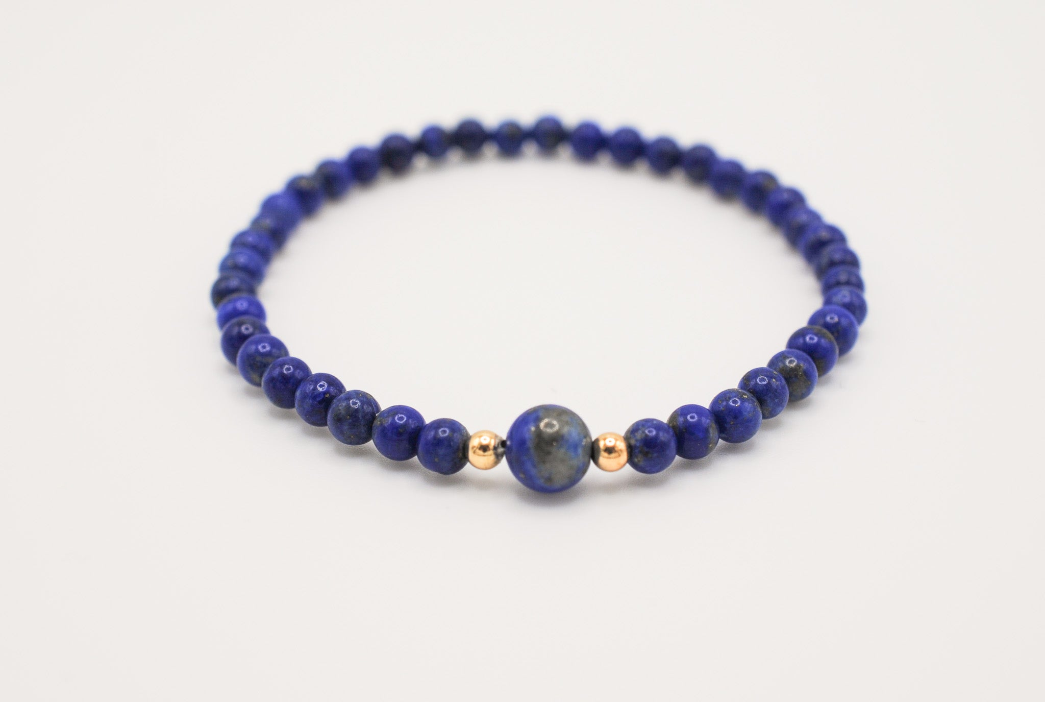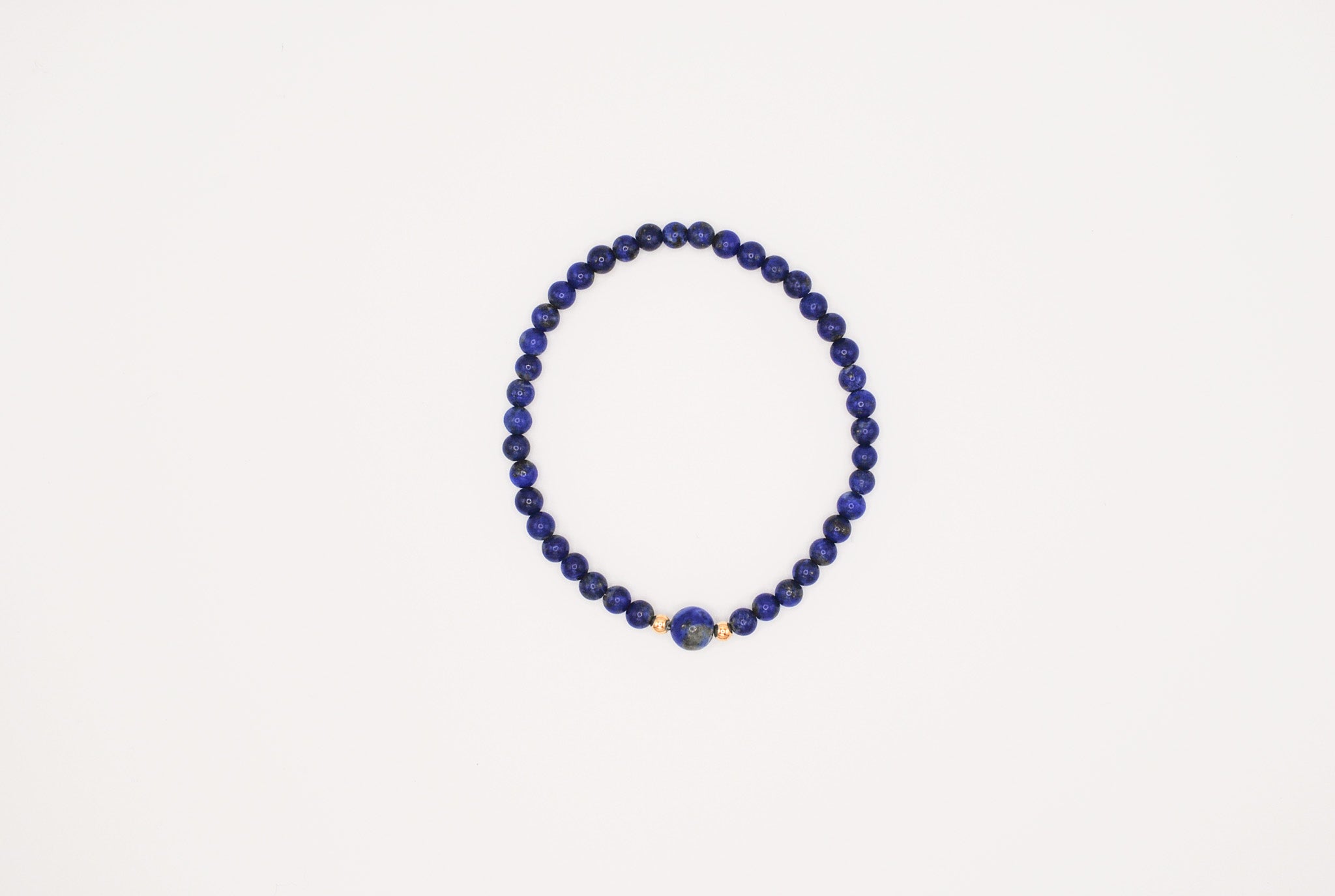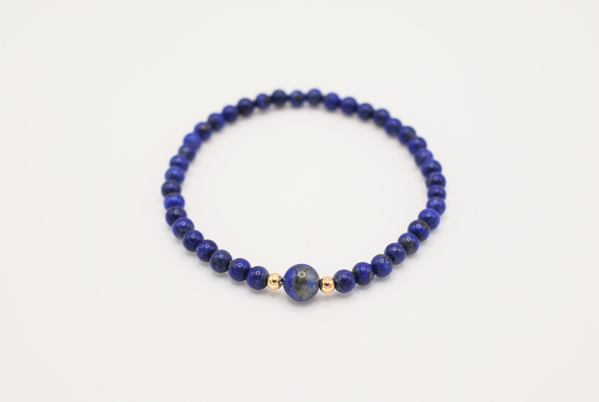 Details: 4mm beaded lapis lazuli gemstones with (1) 6mm beaded lapis lazuli gemstone and (2) 14K Gold Filled beads