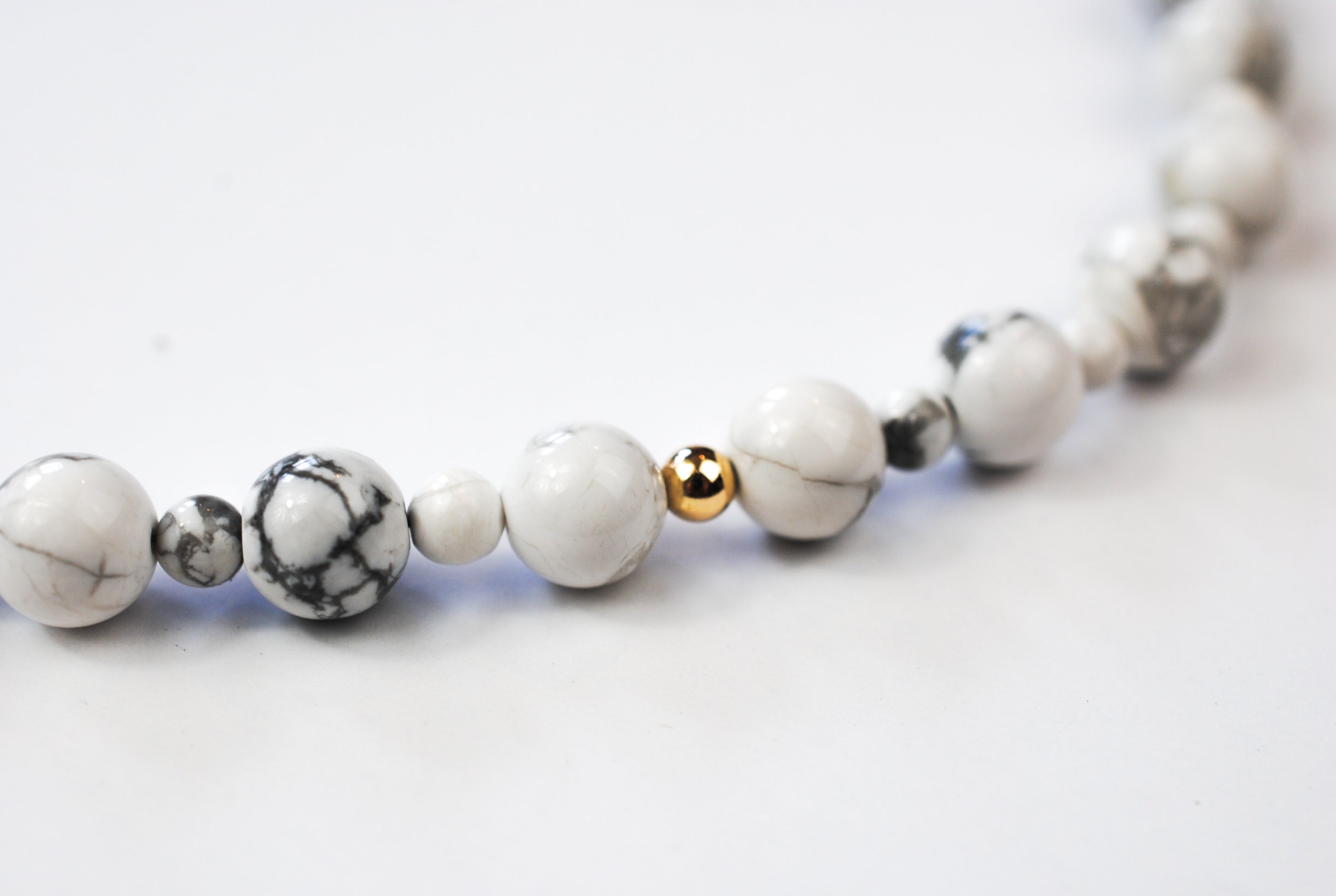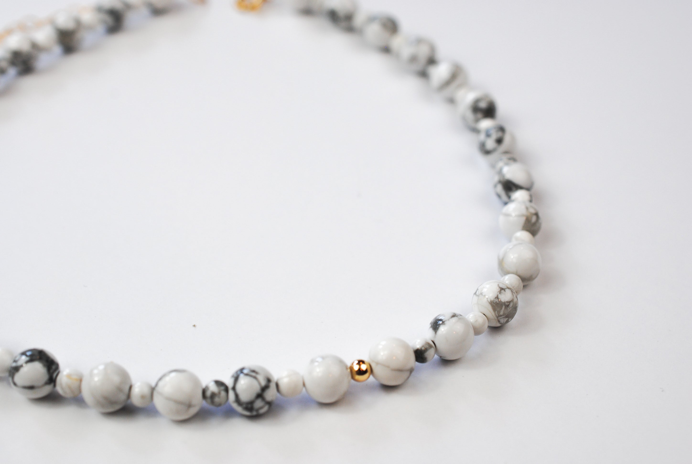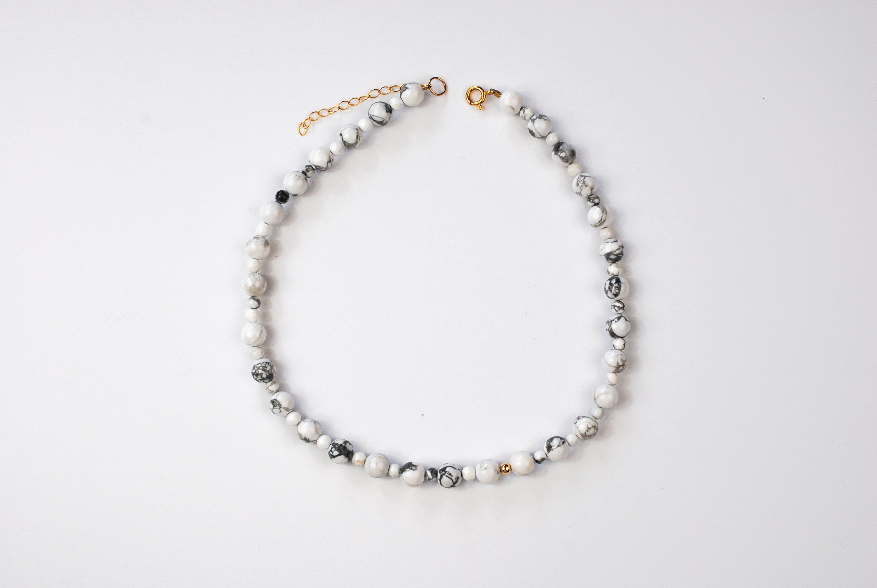 Size: 14 inch choker strung with howlite stones and 1 gold filled off center bead with a 2 inch gold filled extender chain