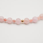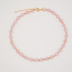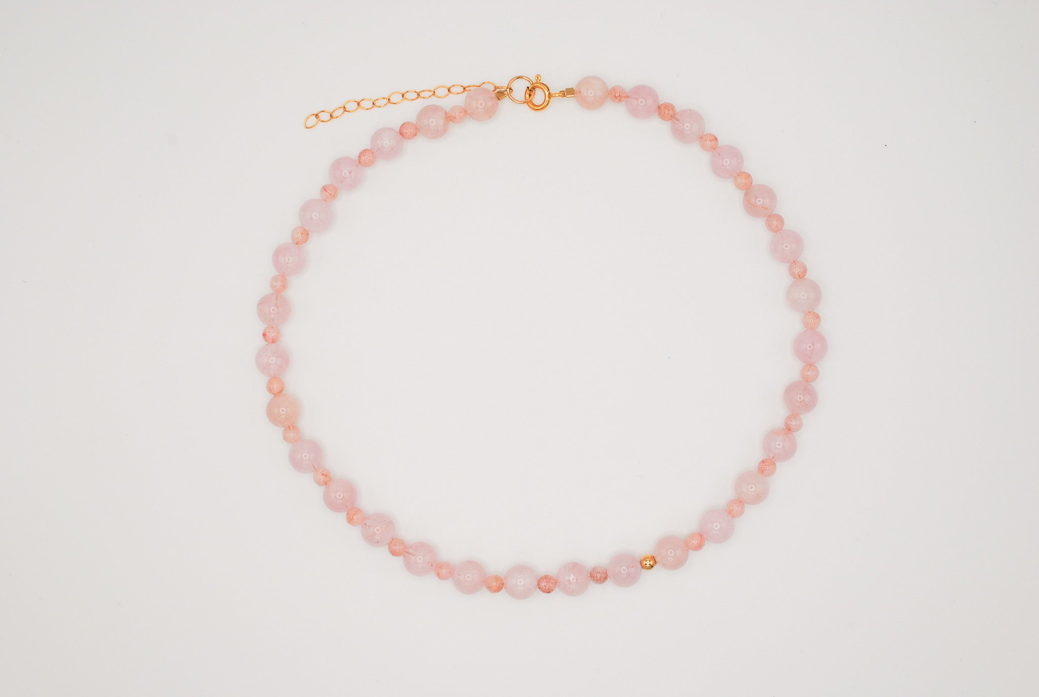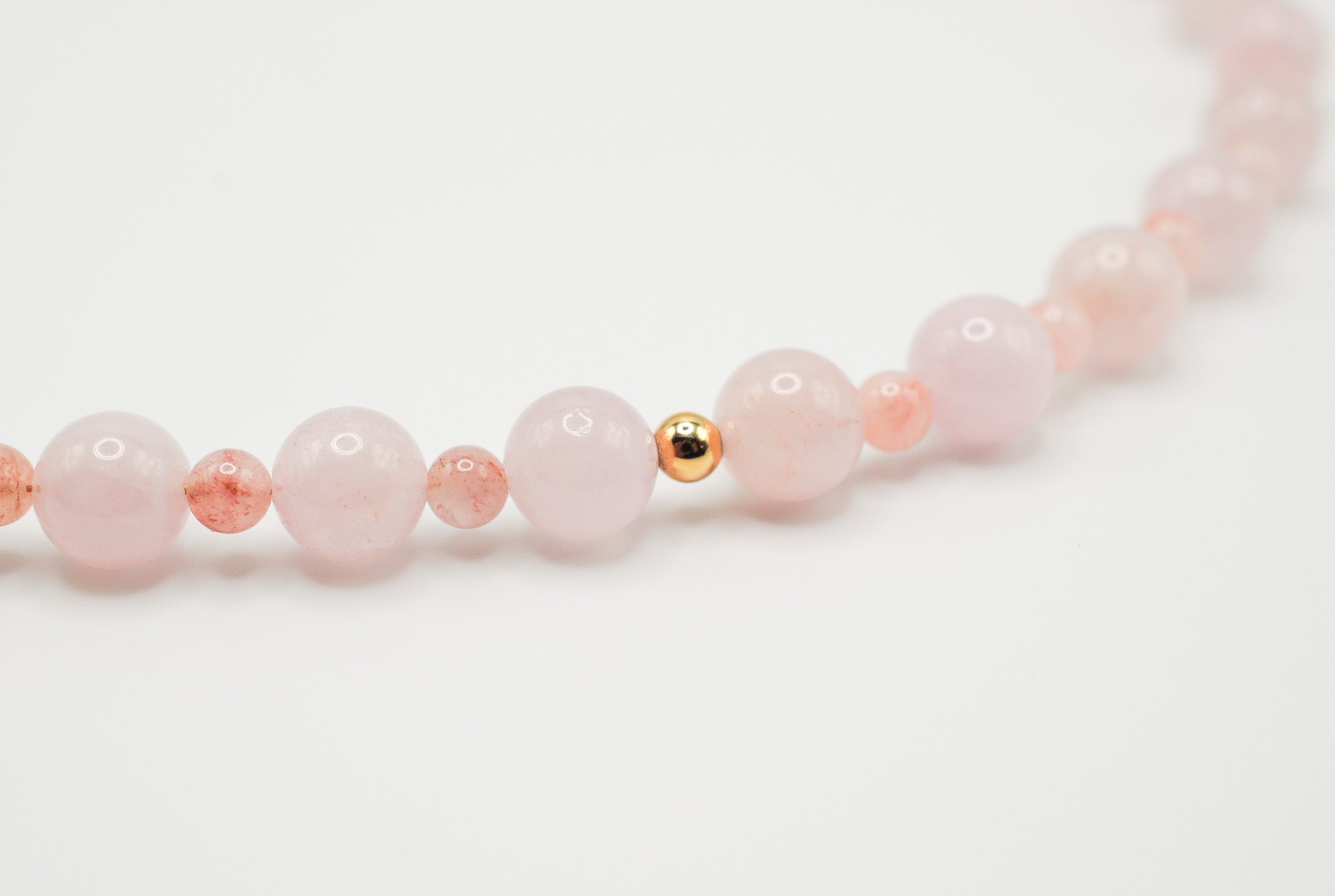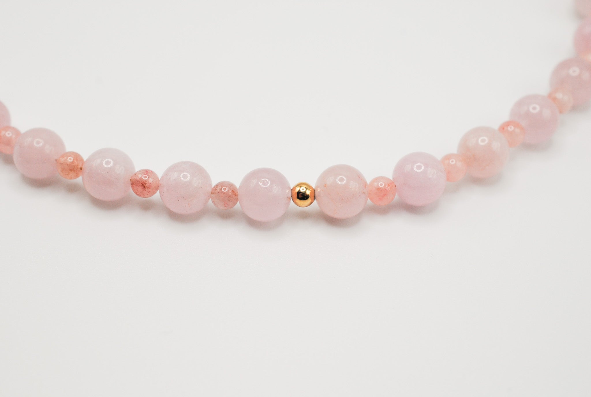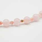 Size: 14 inch choker strung with morganite and 1 gold filled off center bead with a 2 inch gold filled extender chain