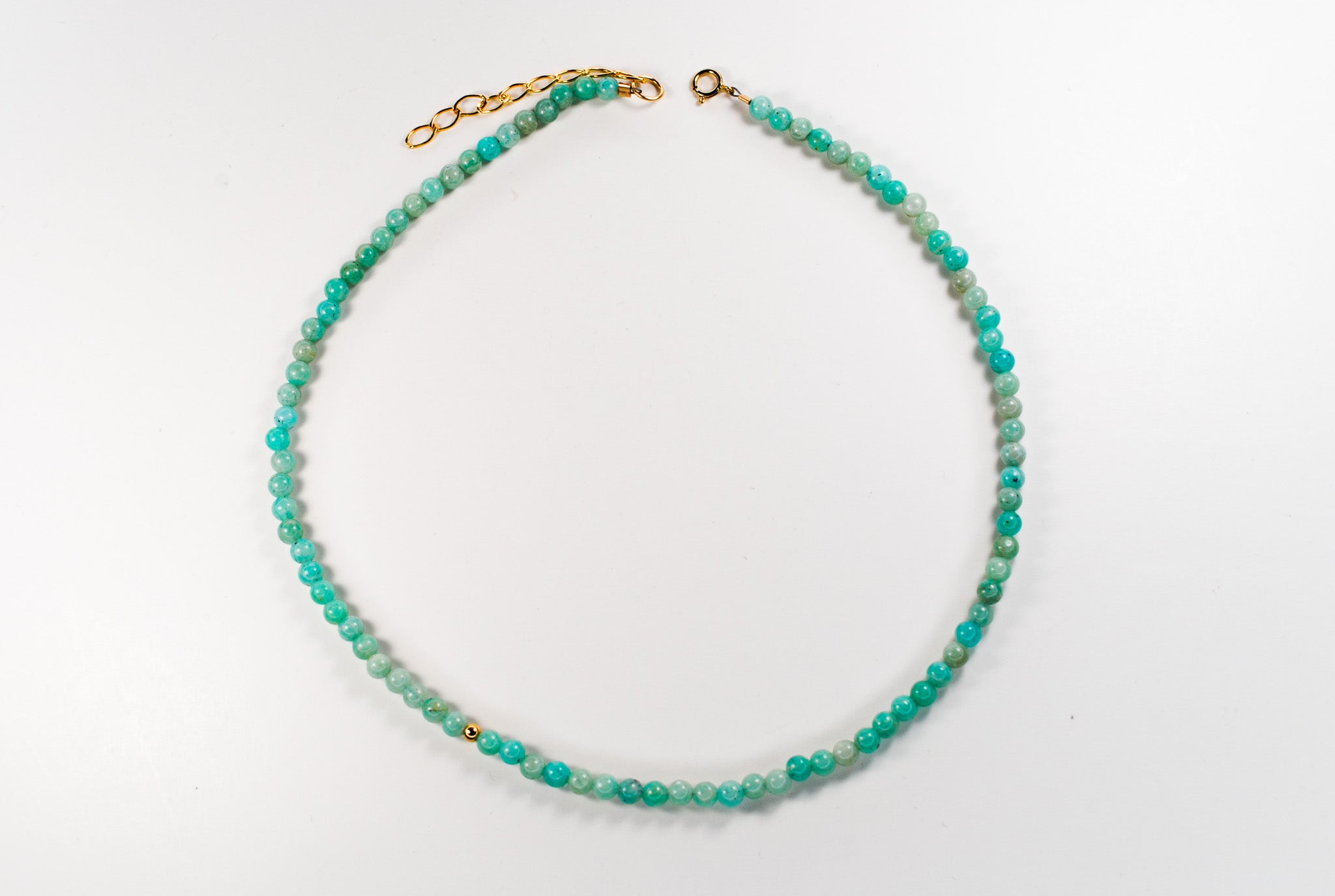 Size: 14 inch choker strung with 4mm amazonite stones and 1 gold filled off center bead with a 2 inch gold filled extender chain