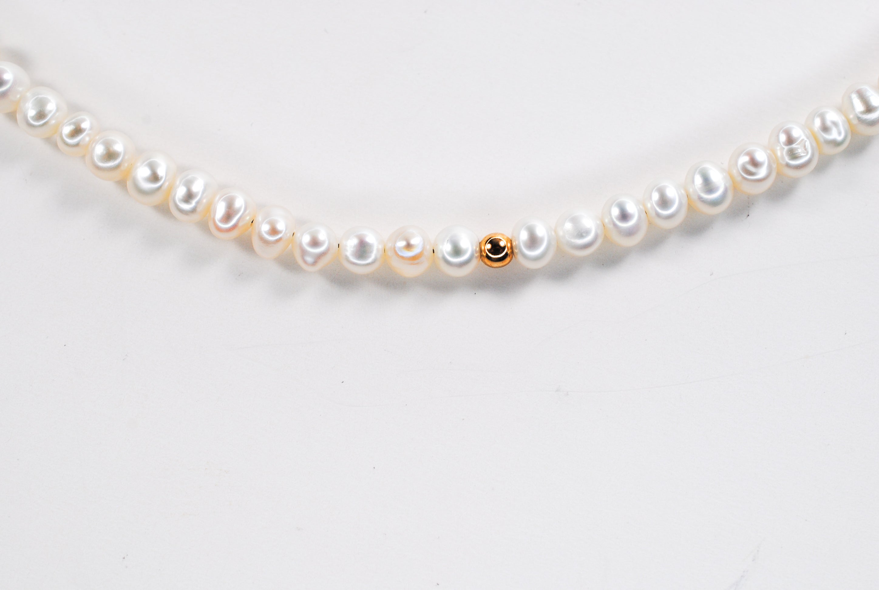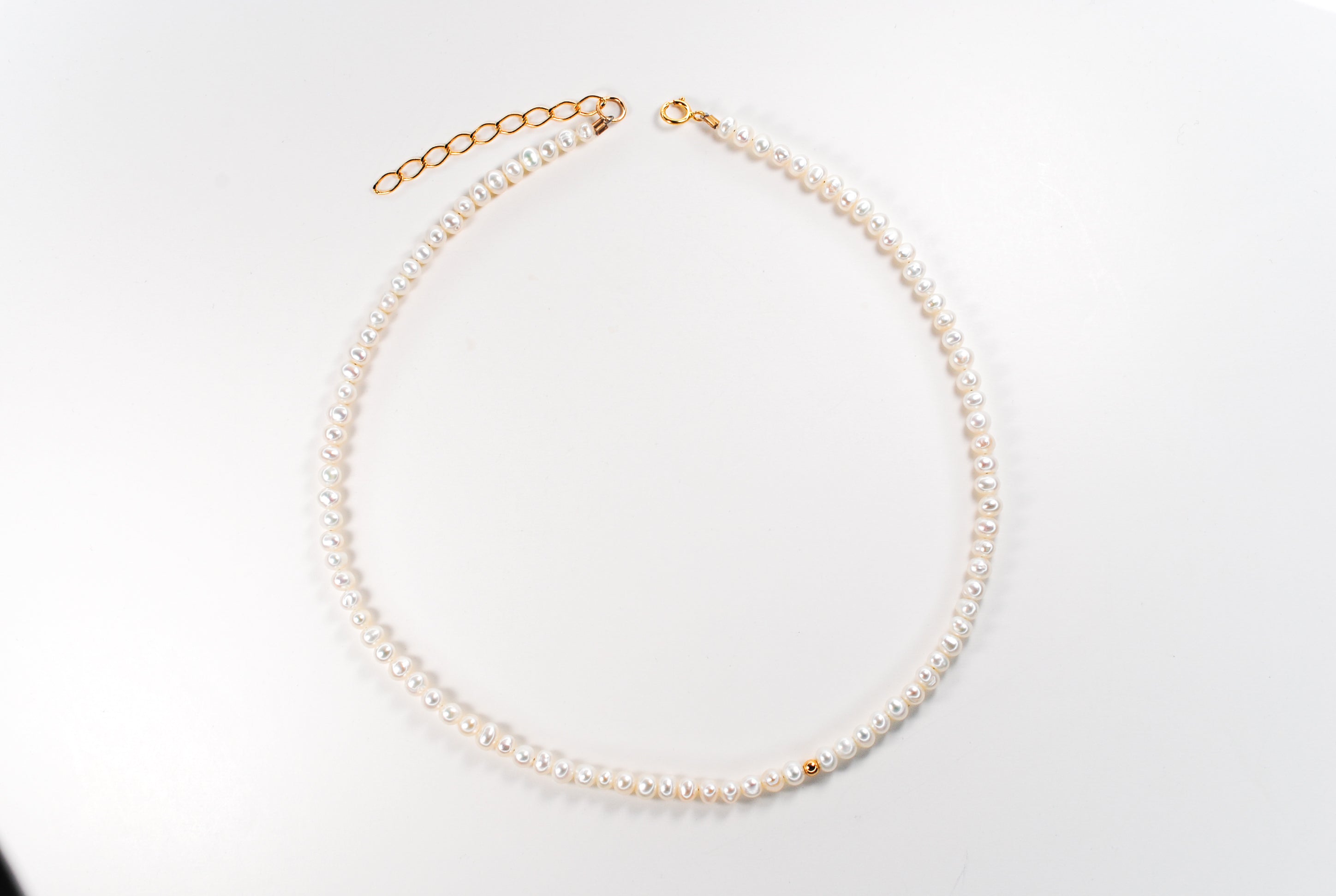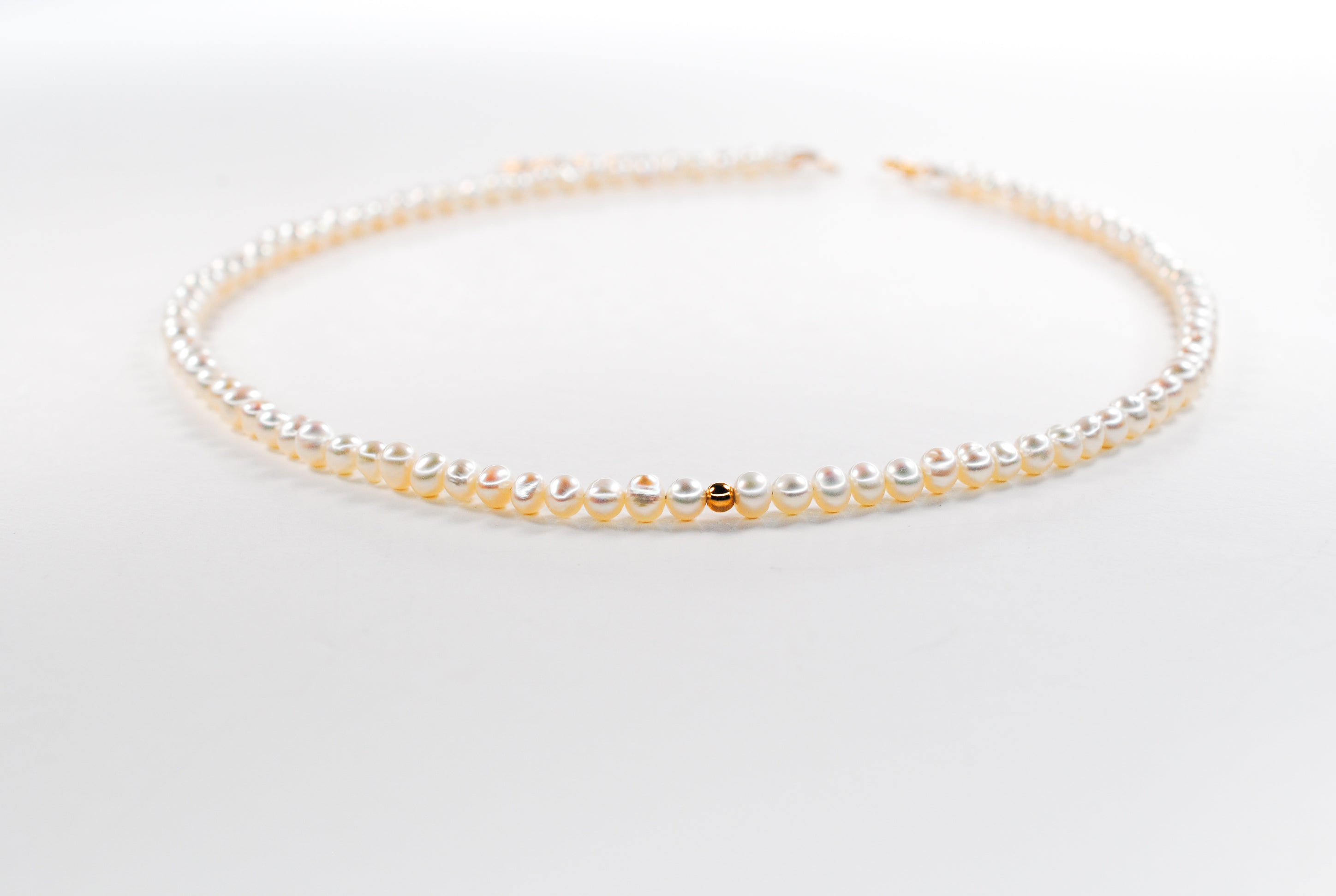 Size: 14 inch choker strung with 4mm freshwater pearls and 1 gold filled off center bead with a 2 inch gold filled extender chain