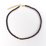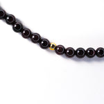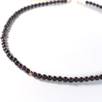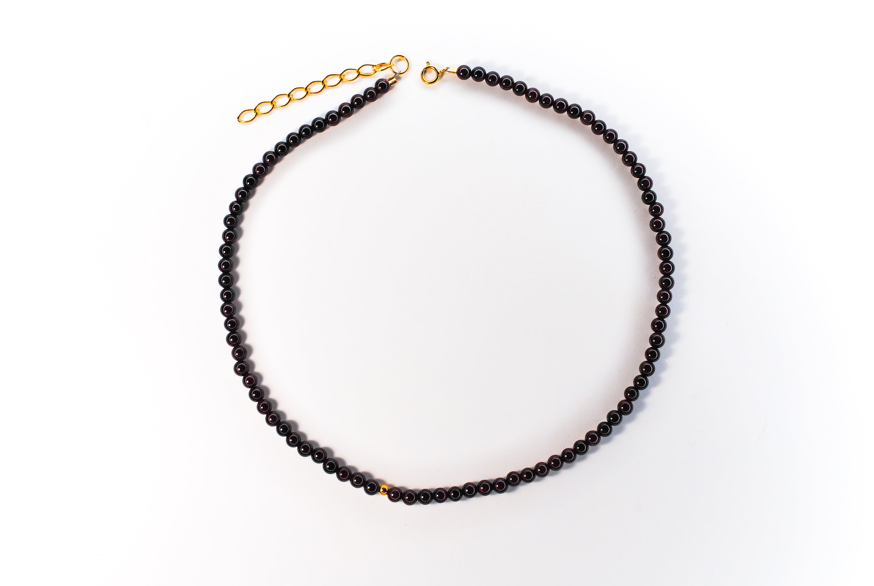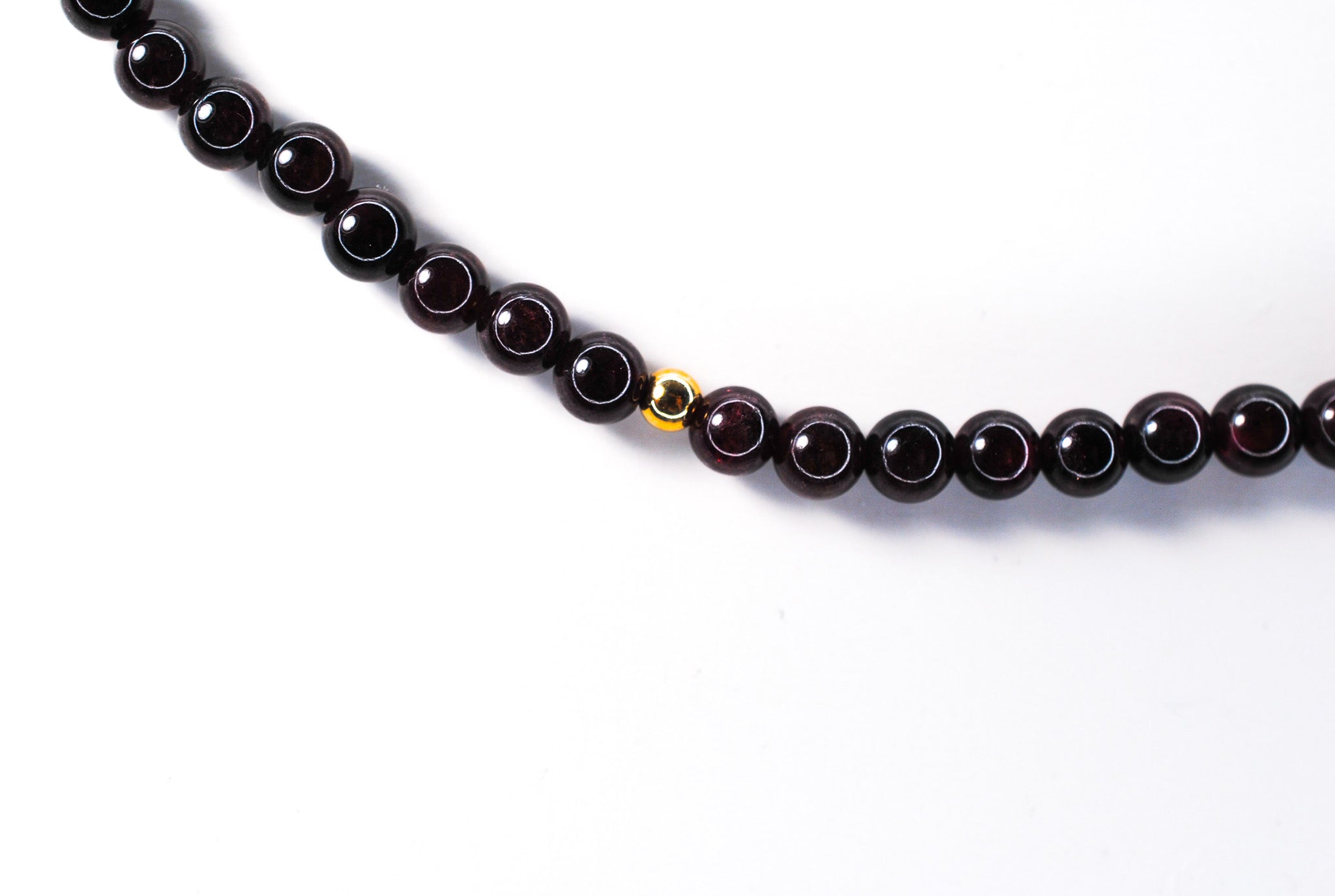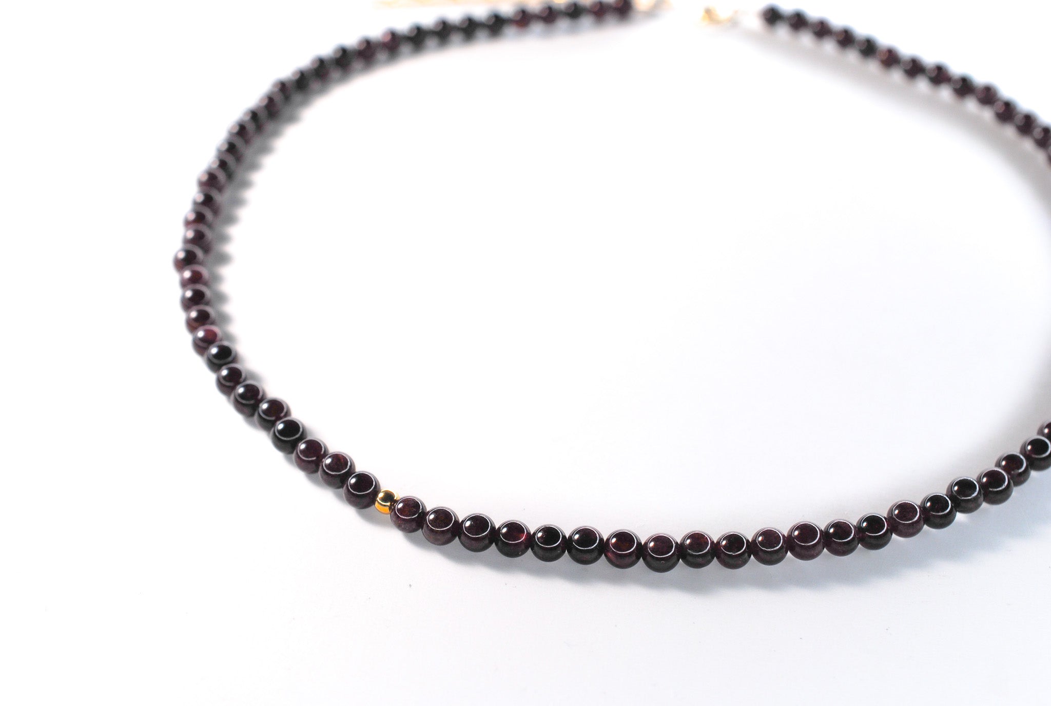 Size: 14 inch choker strung with 4mm garnet stones and 1 gold filled off center bead with a 2 inch gold filled extender chain