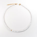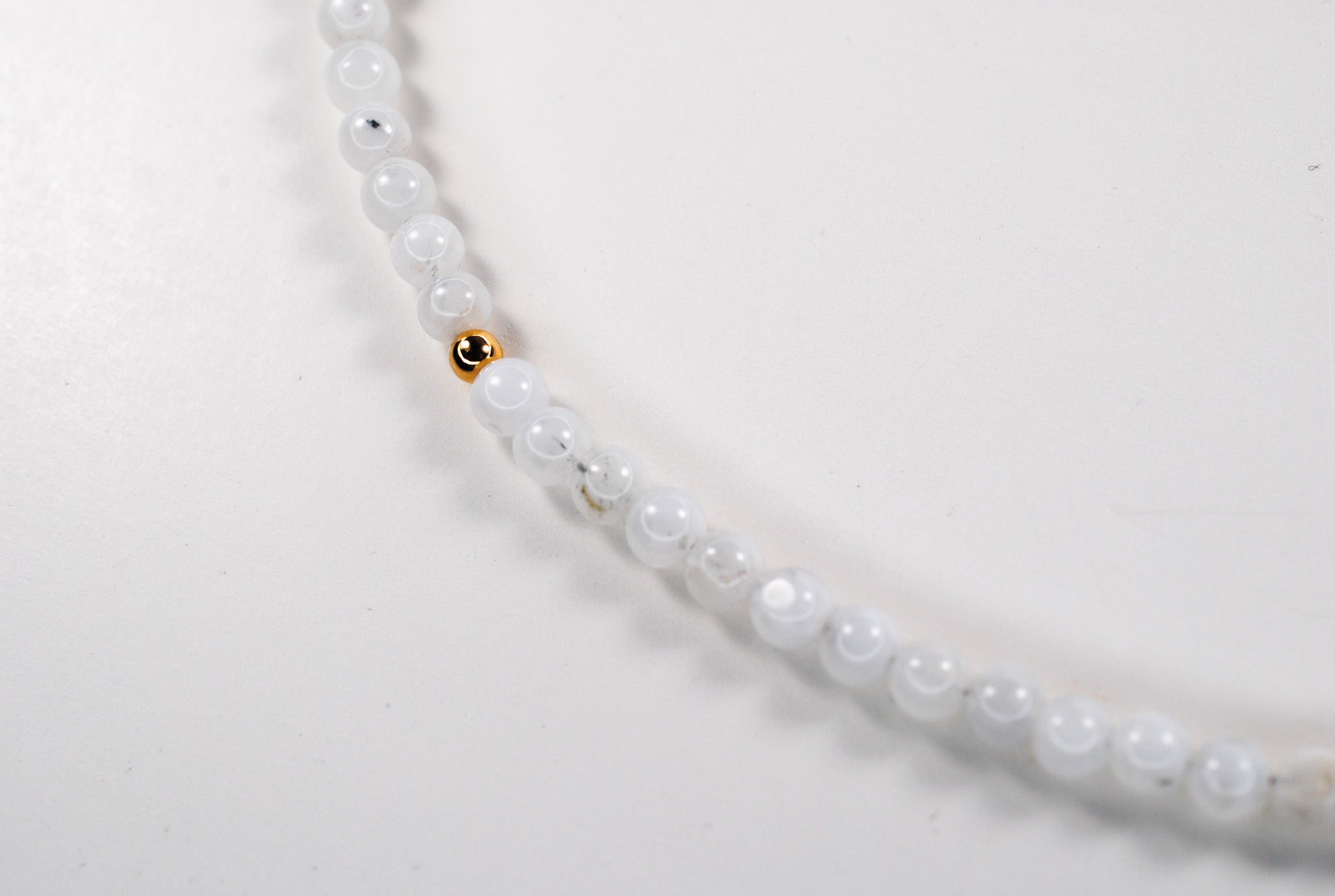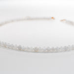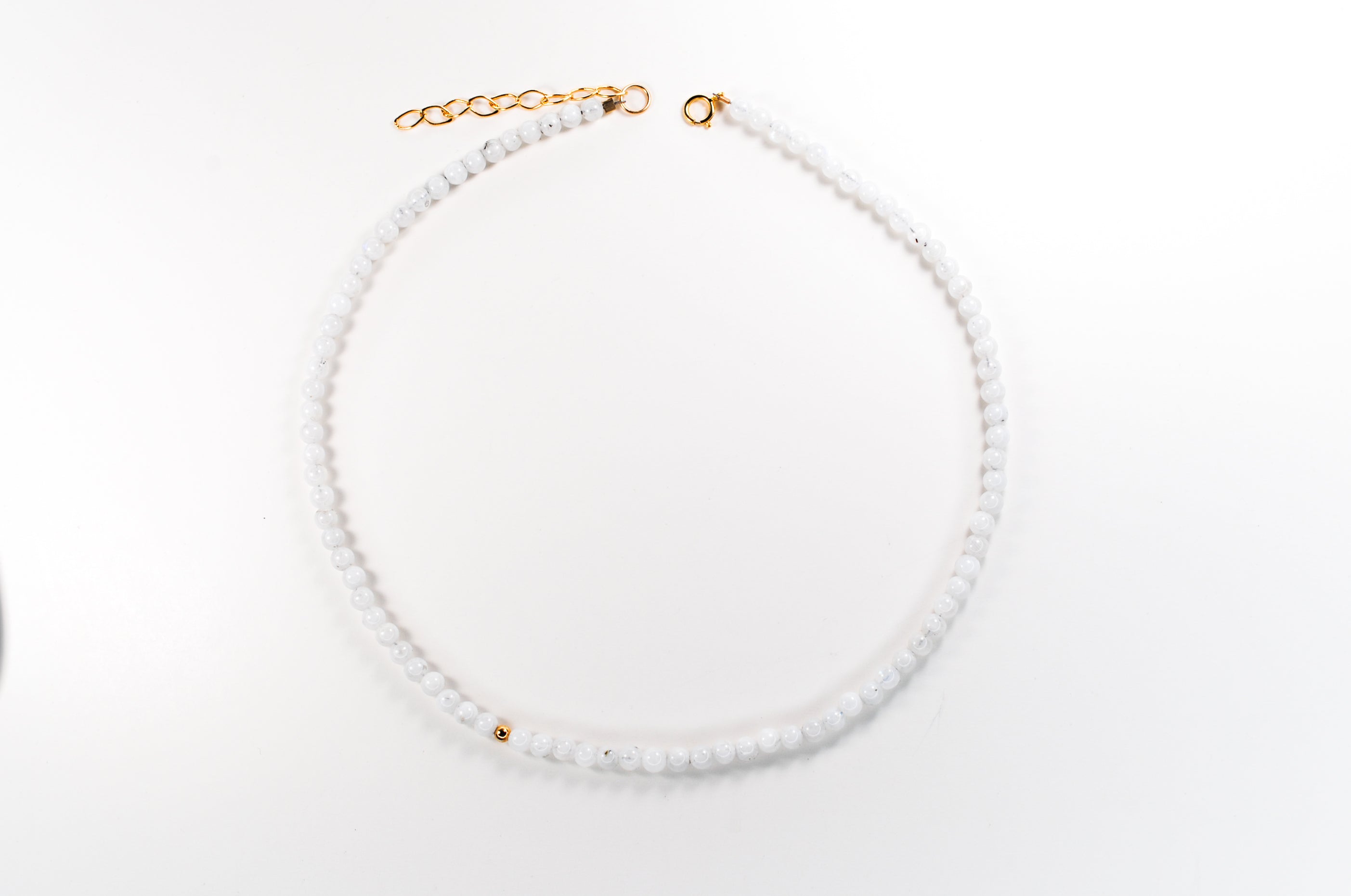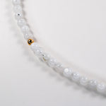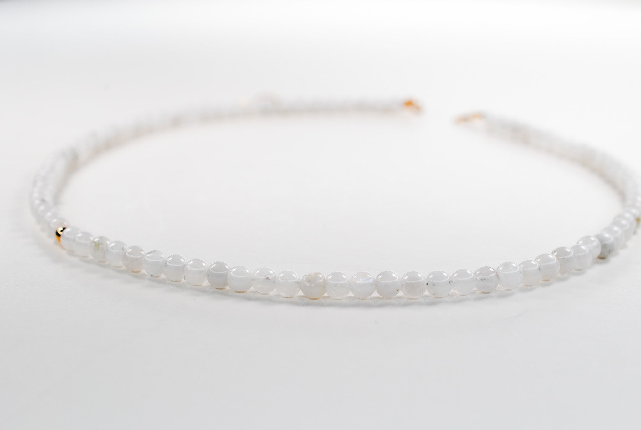 Size: 14 inch choker strung with 4mm moonstone stones and 1 gold filled off center bead with a 2 inch gold filled extender chain