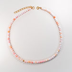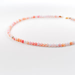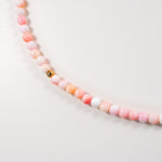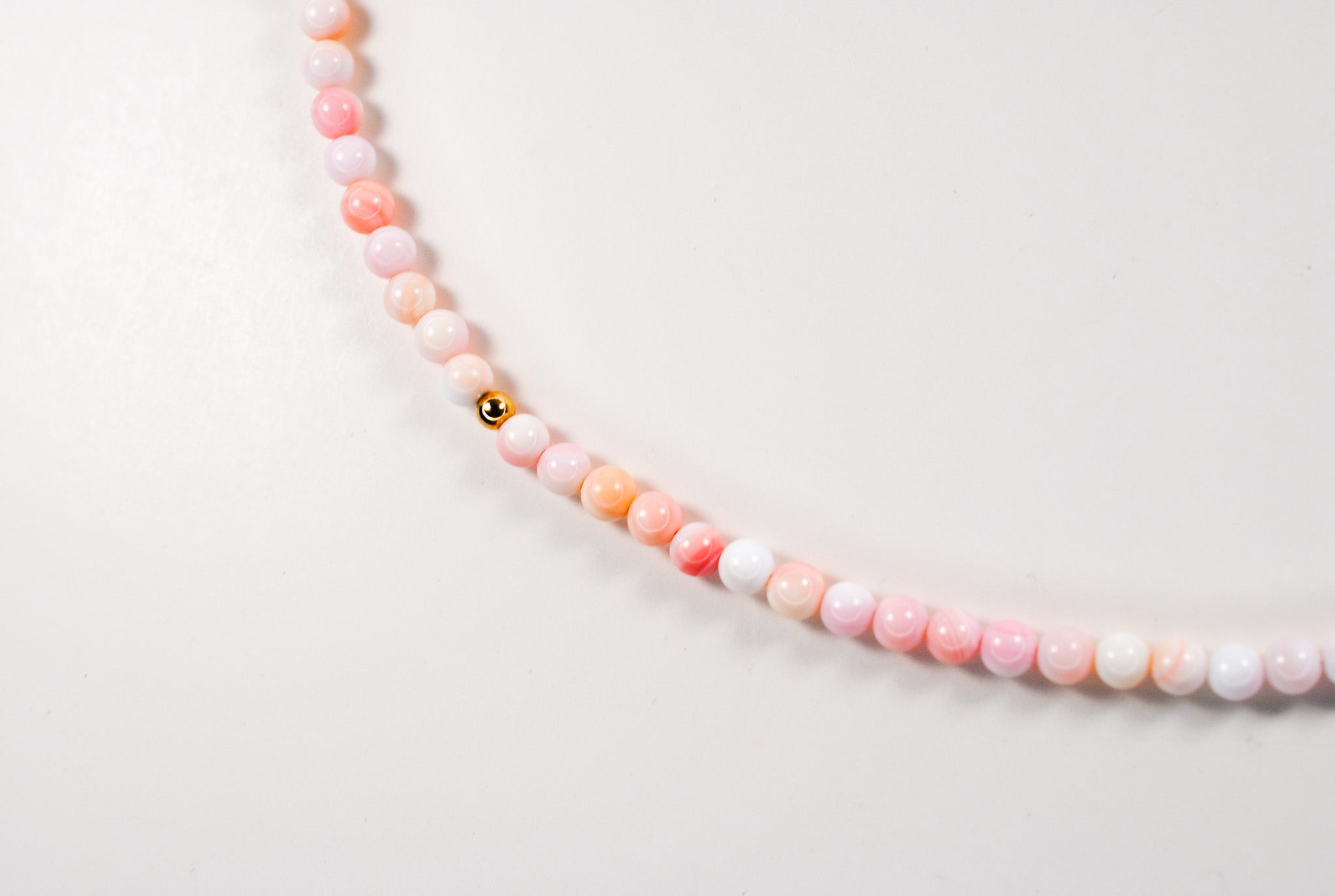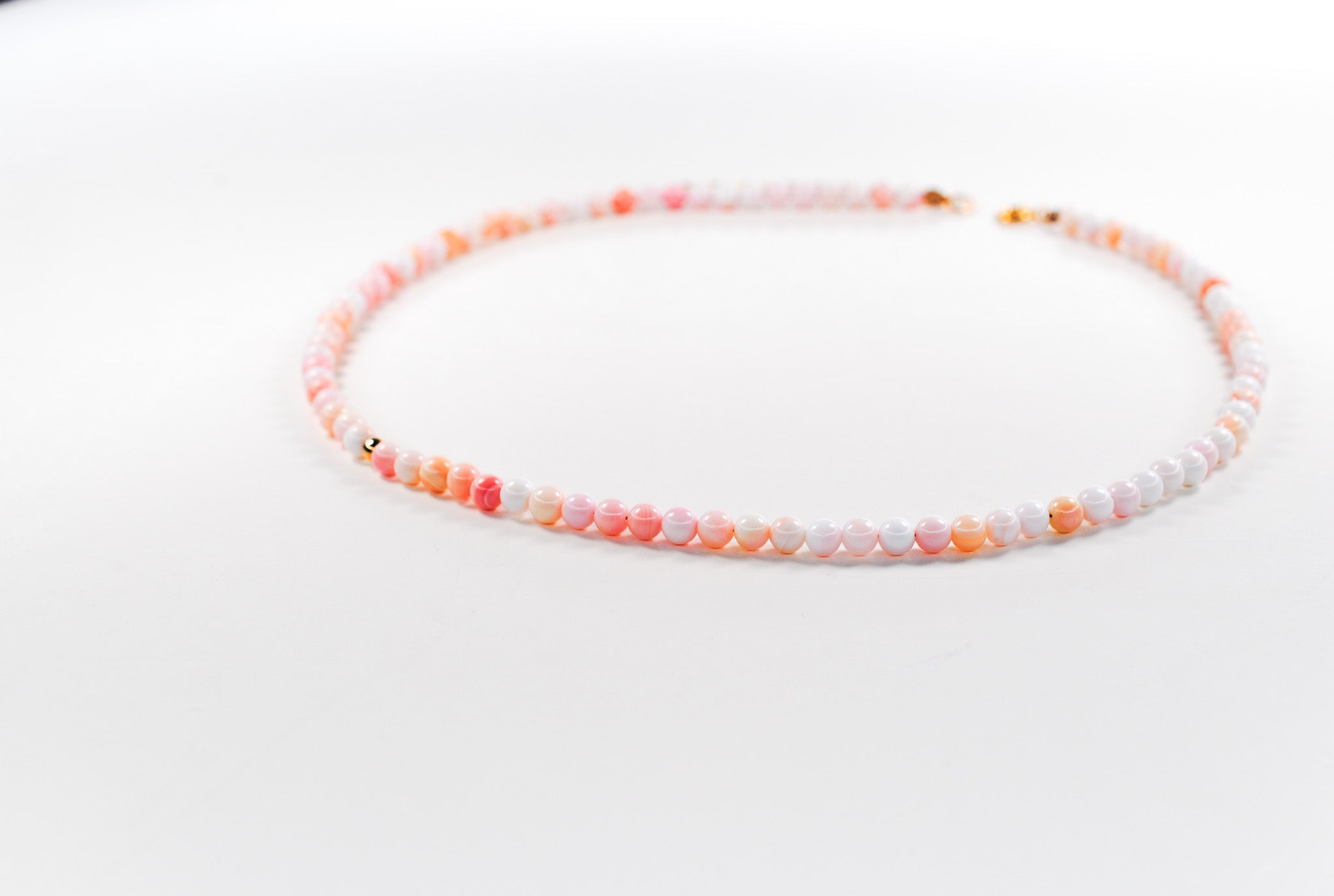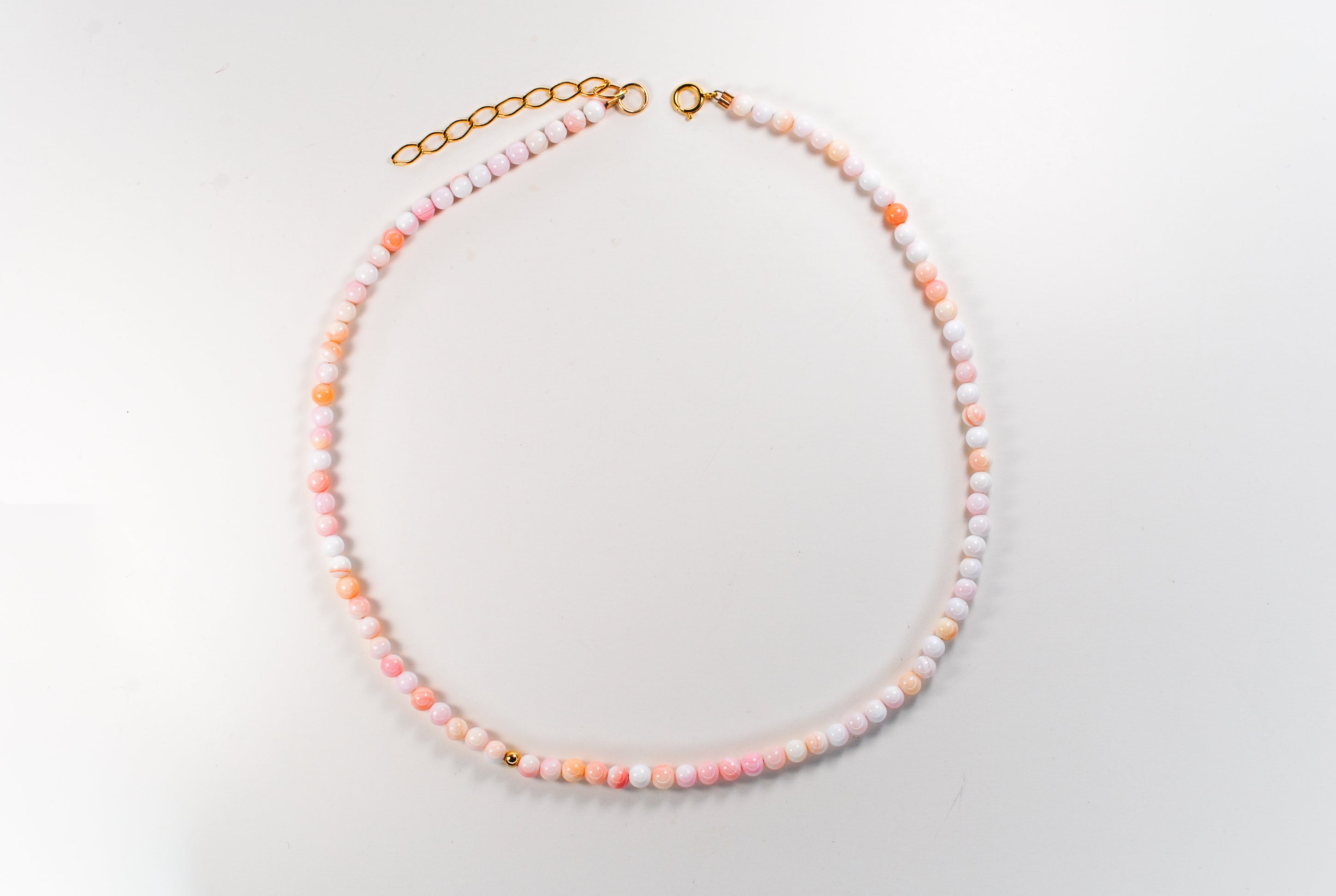 Size: 14 inch choker strung with 4mm queen conch shell stones and 1 gold filled off center bead with a 2 inch gold filled extender chain
