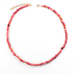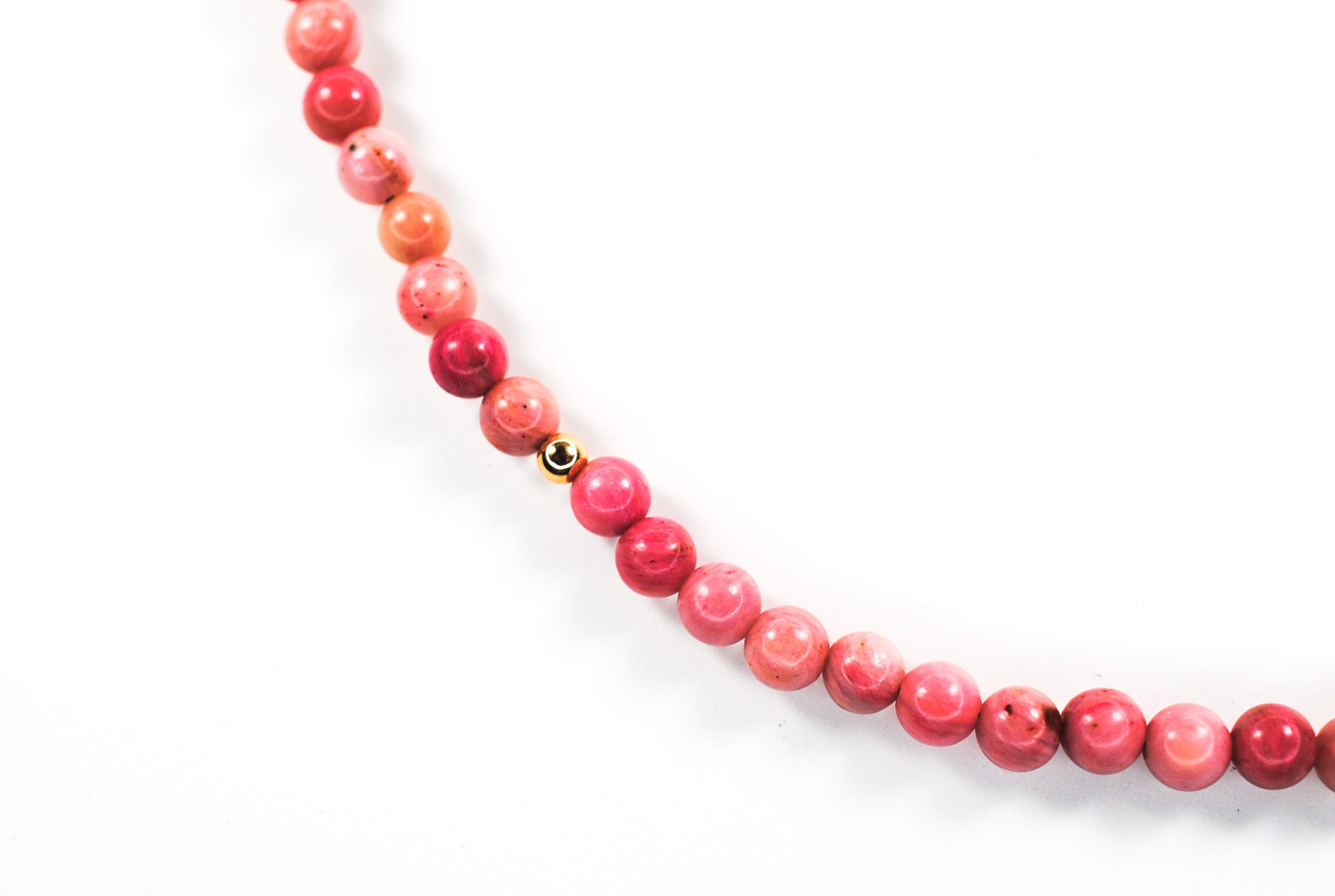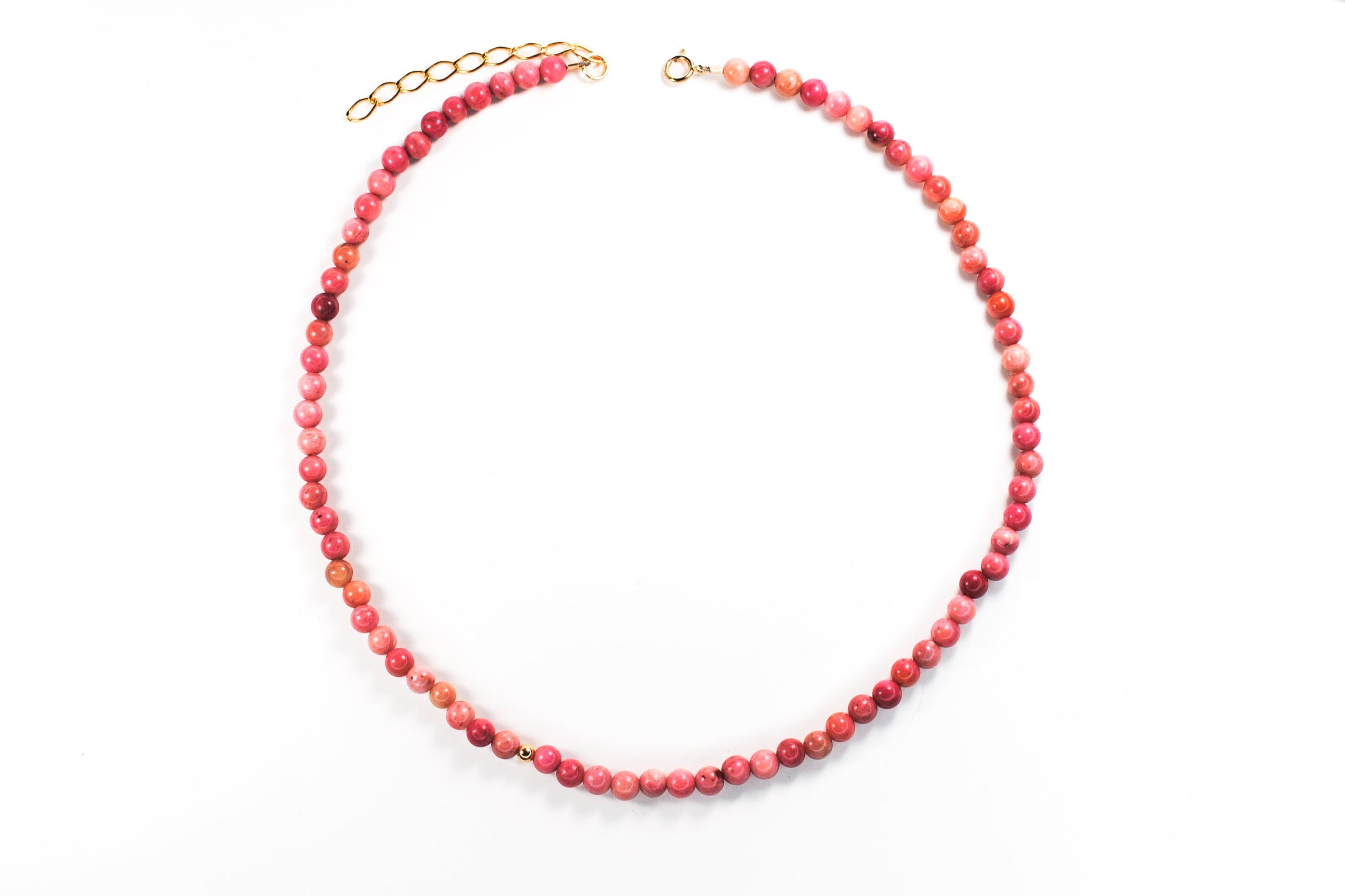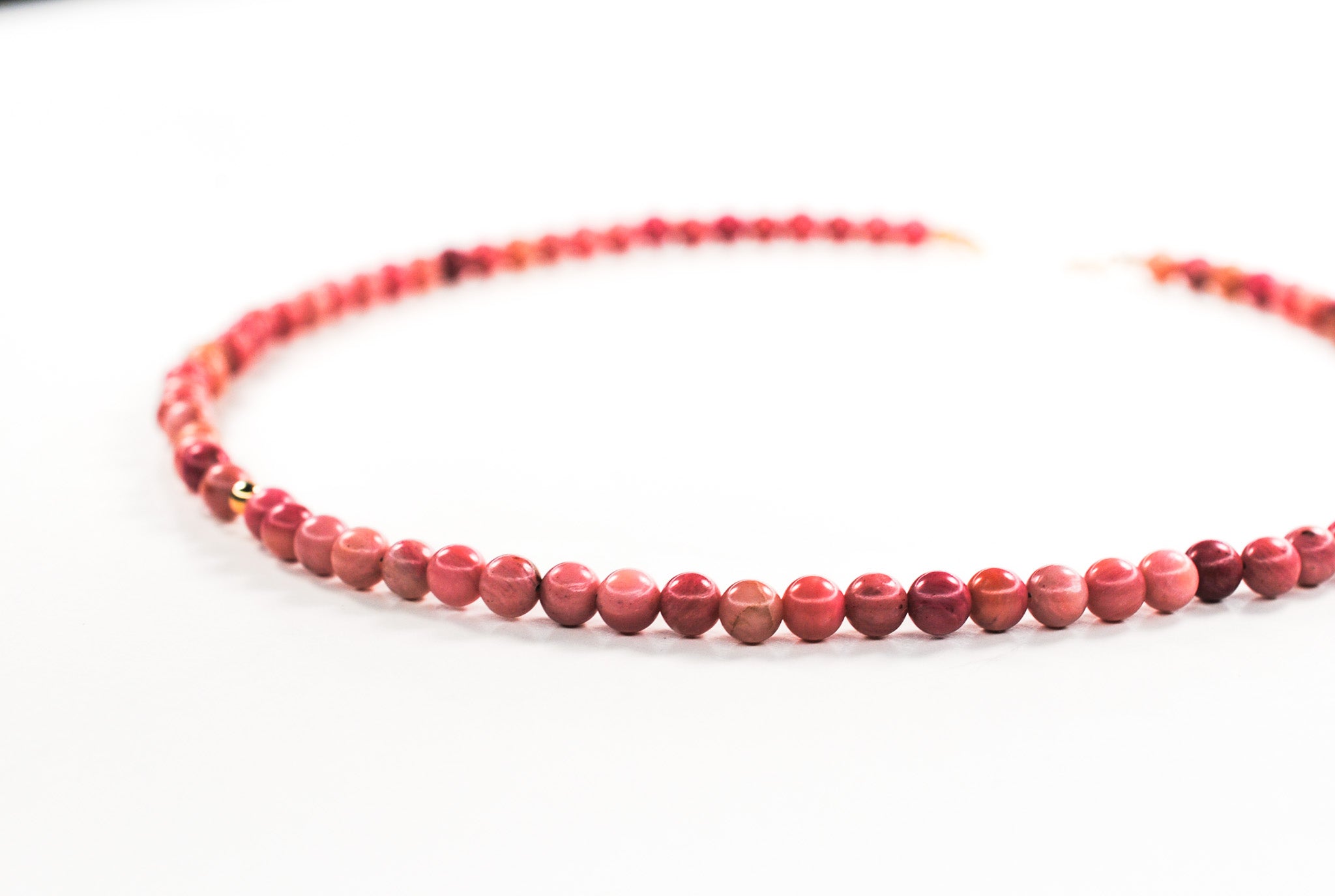 Size: 14 inch choker strung with 4mm rhodonite stones and 1 gold filled off center bead with a 2 inch gold filled extender chain