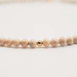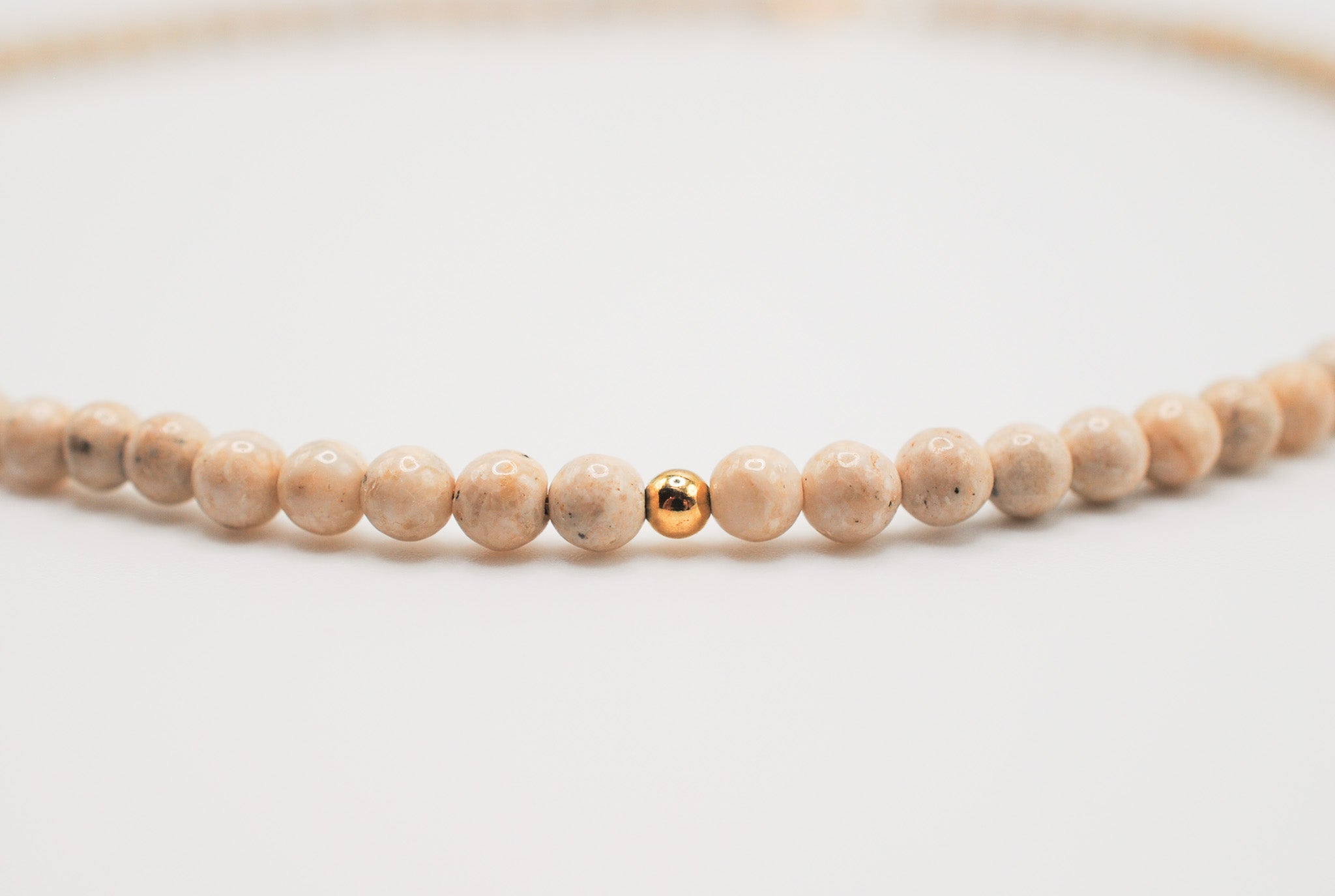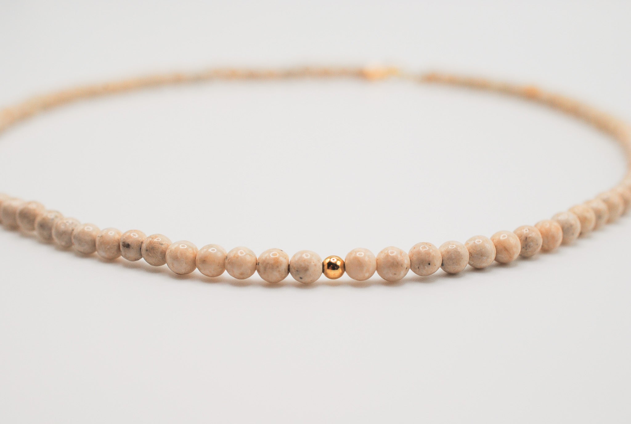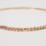 Size: 14 inch choker strung with 4mm riverstones and 1 gold filled off center bead with a 2 inch gold filled extender chain