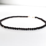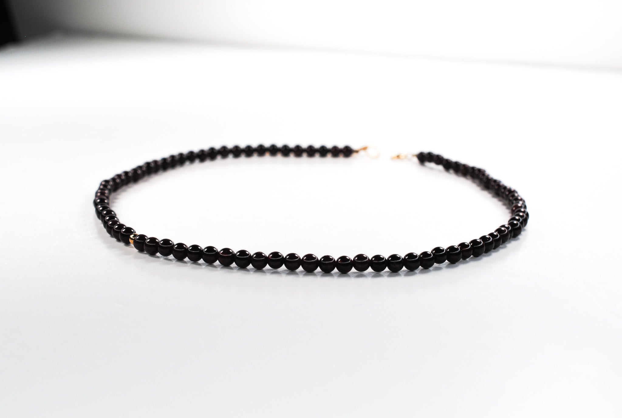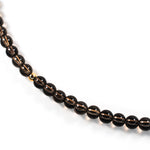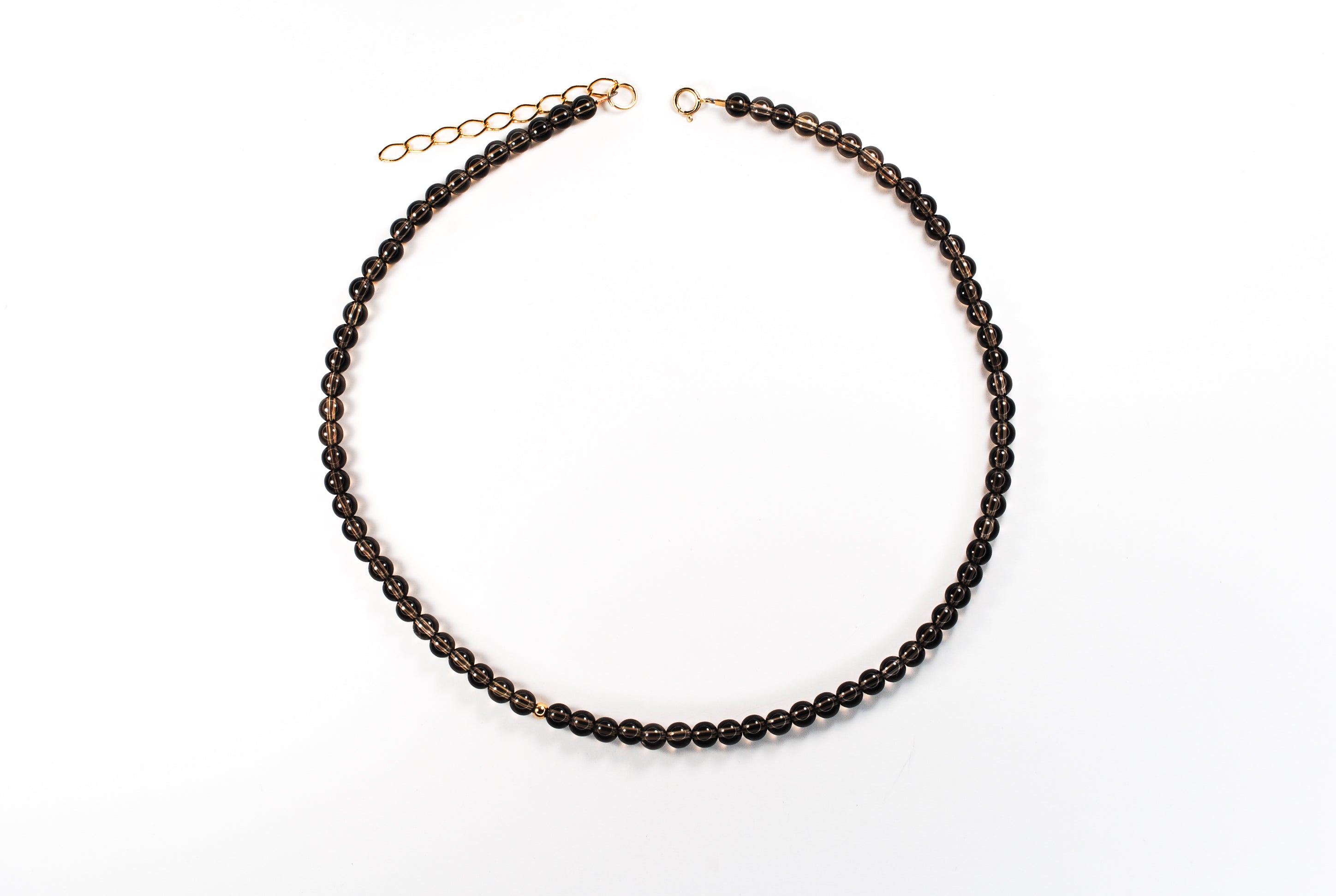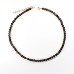 Size: 14 inch choker strung with 4mm smokey quartz stones and 1 gold filled off center bead with a 2 inch gold filled extender chain